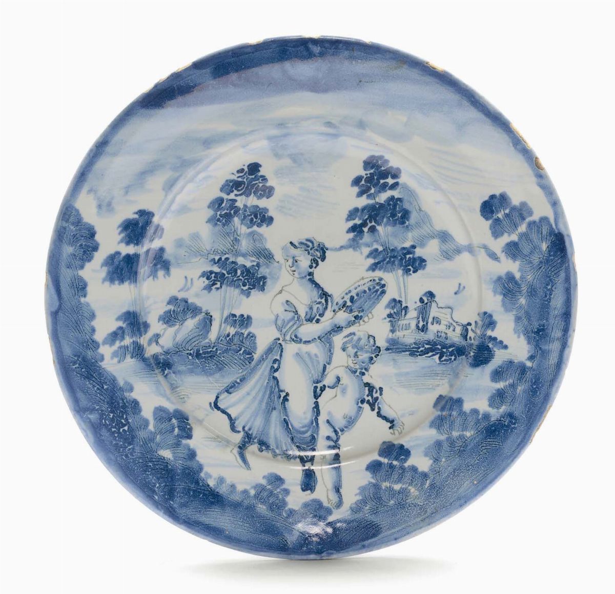 Piatto in maiolica con decoro a scenografia barocca, Albisola XVIII secolo