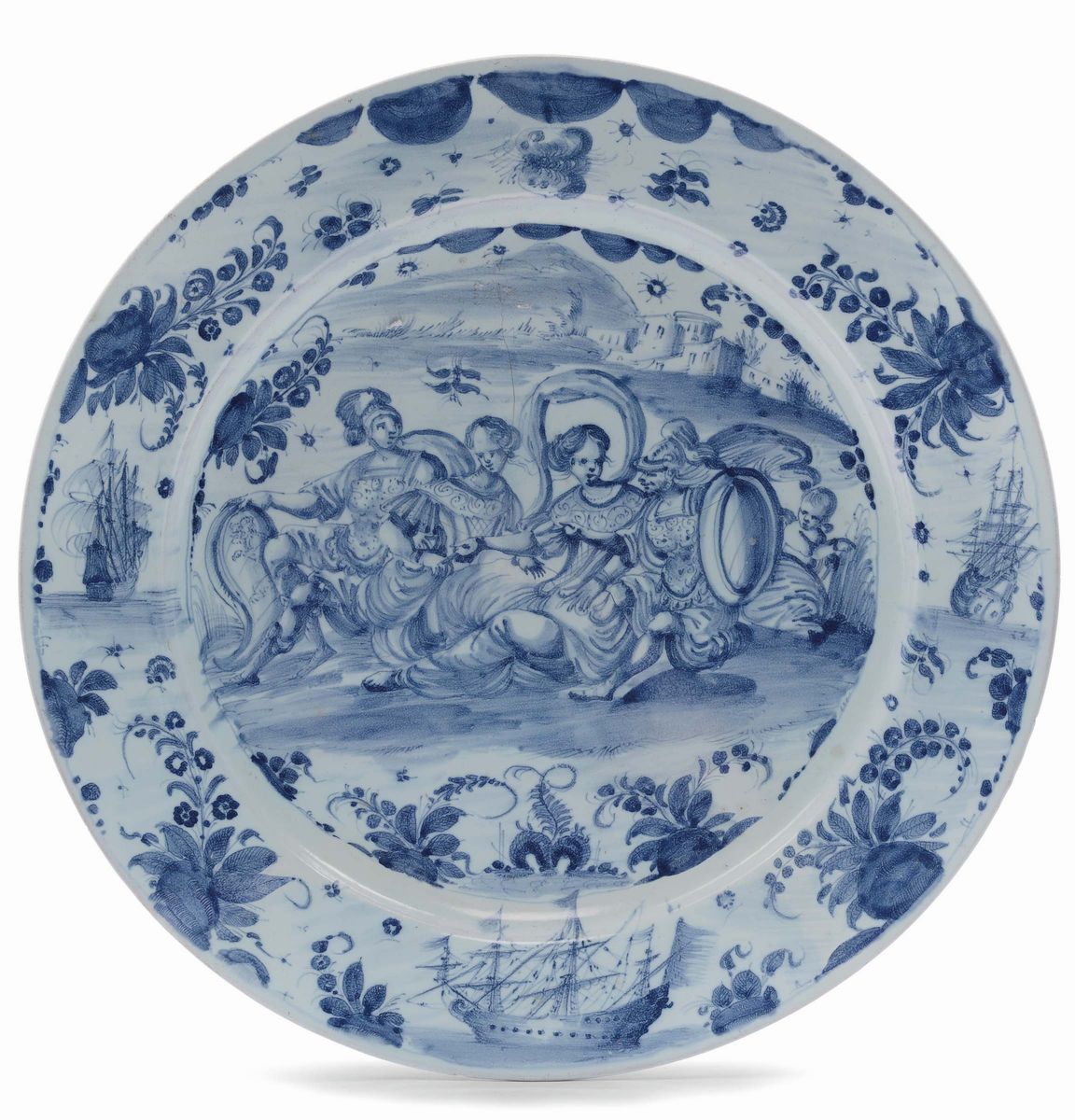 tesa decortata con velieri e motivi vegetali e frutta, centro del cavetto con scena galante entro paesaggio, marca Stemma, diametro cm 46 (restauri)