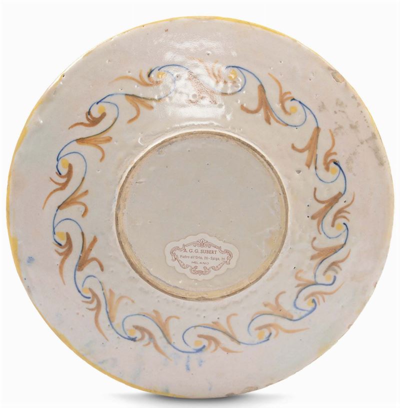 Tagliere in maiolica istoriata raffigurante condottiero a cavallo, forse il mito del Capitano Battistone Castellini, Faenza XVI secolo (forse imitazione XIX secolo)