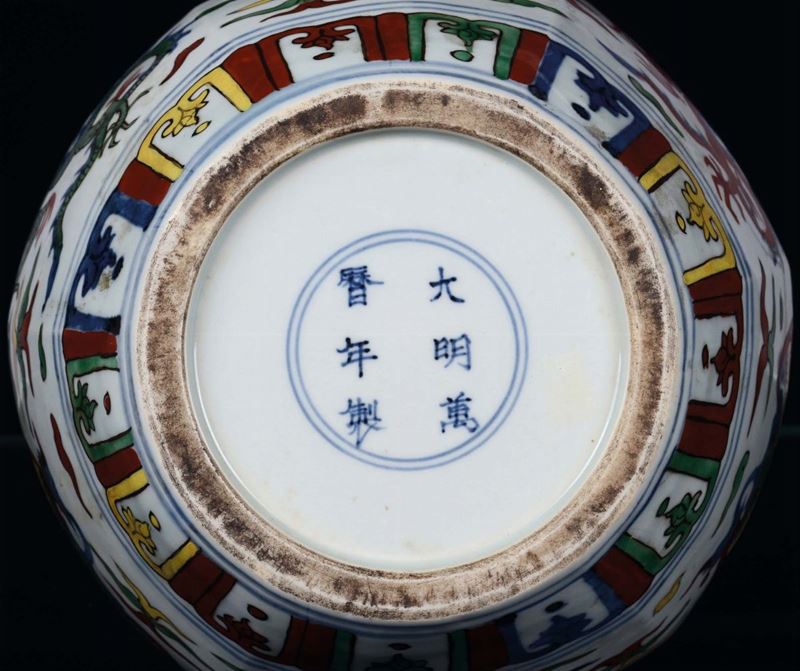 A double-pumpkin polychrome porcelain vase decorated with dragons and phoenixes, China 20th century. Apocryphal mark