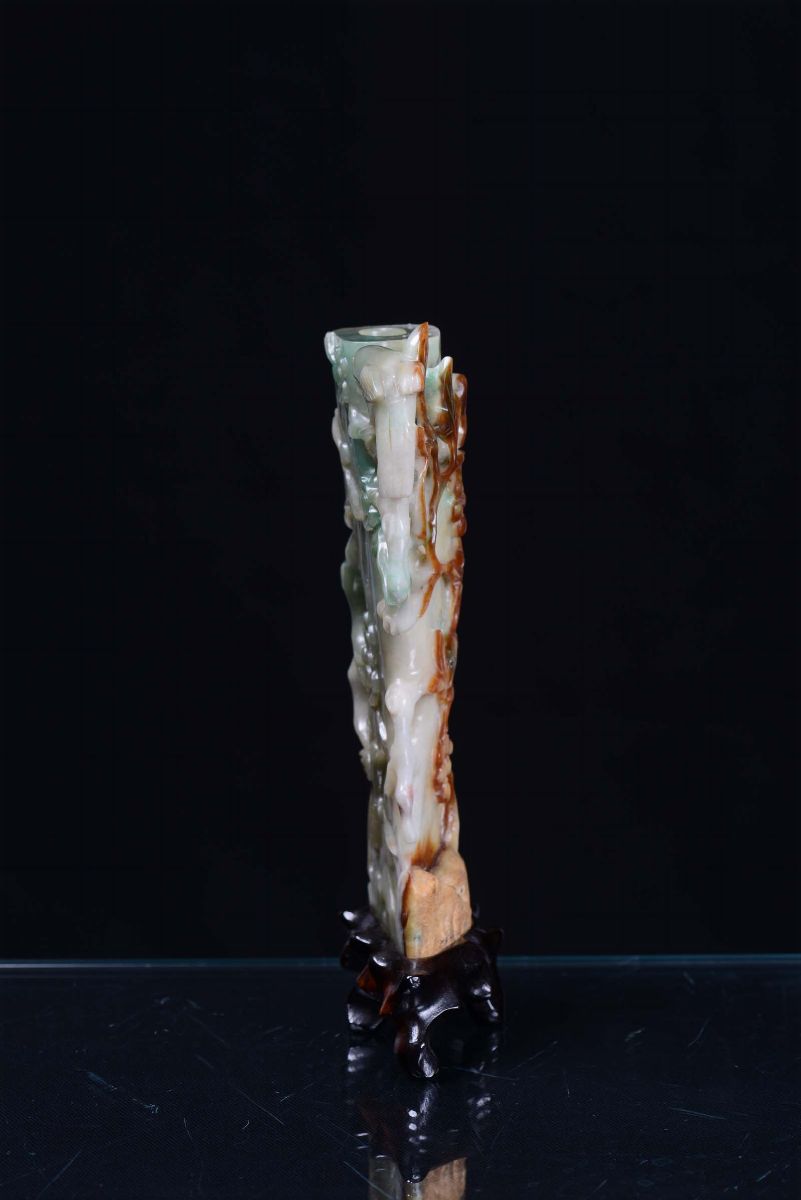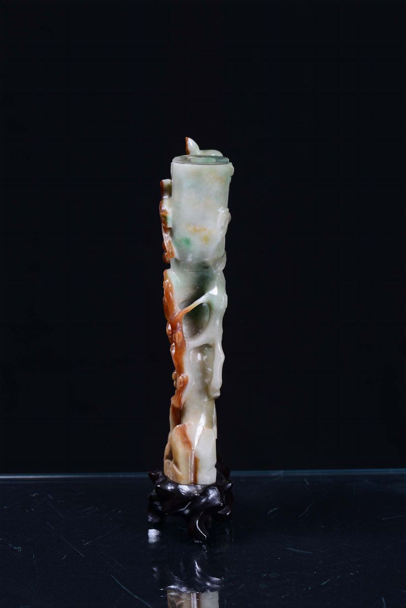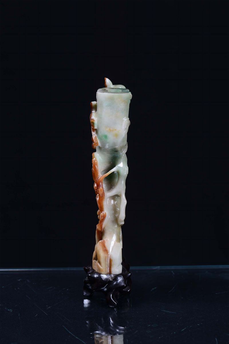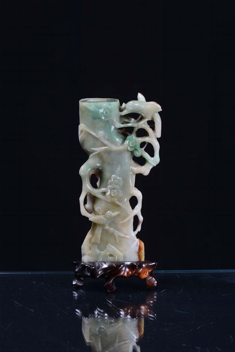 A green and russet jadeite vase sculpted with little birds and squirrels, China, 20th century
