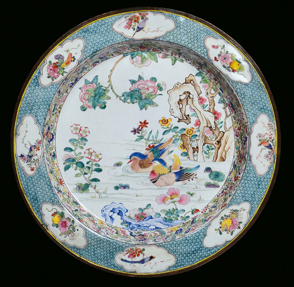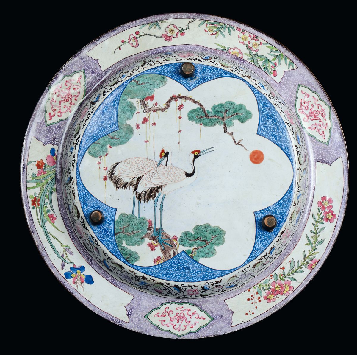 A large enamelled copper plate with polychrome decorations in the colours of the Famille Rose, China, Qing Dynasty, Yongzheng [..]
