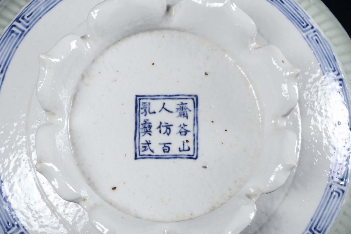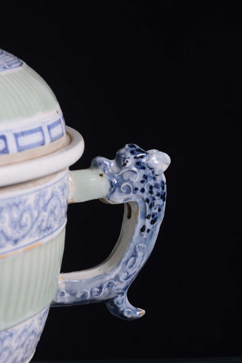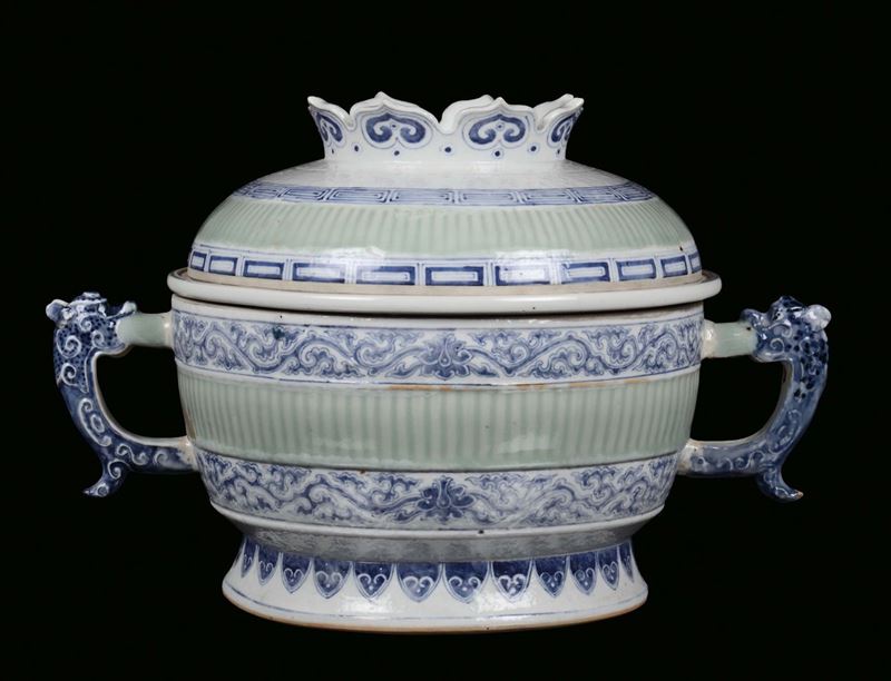 A large green polychrome ceramic tureen with white and blue decoration, China, Qing Dynasty, 19th century