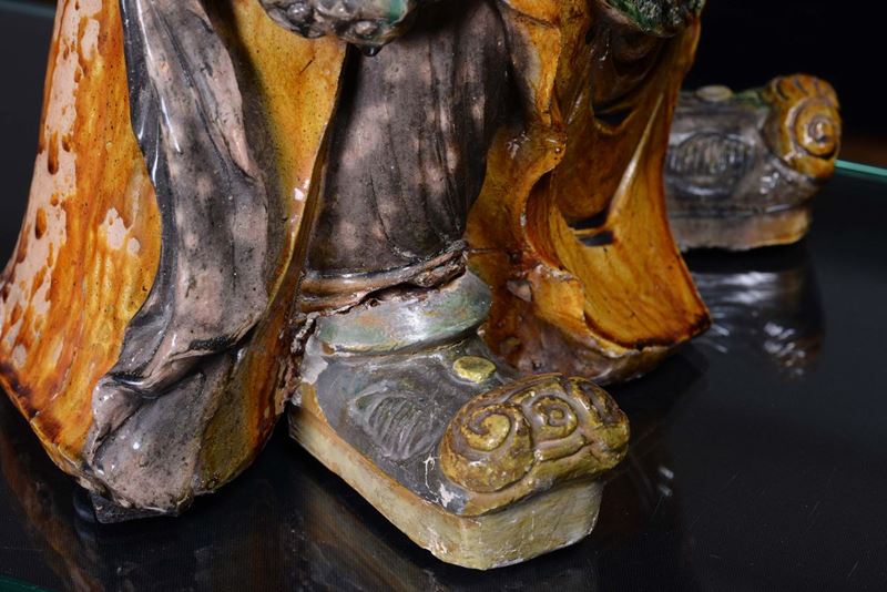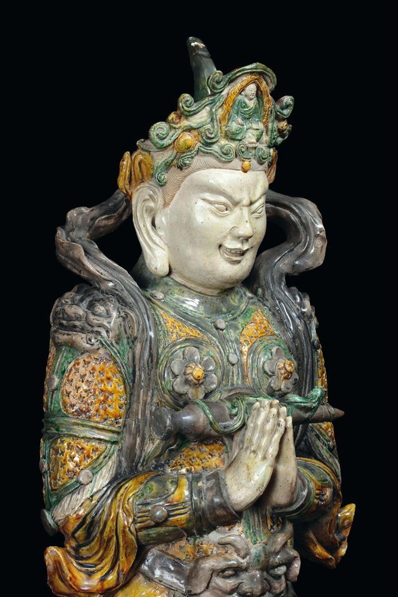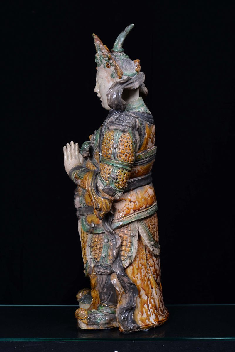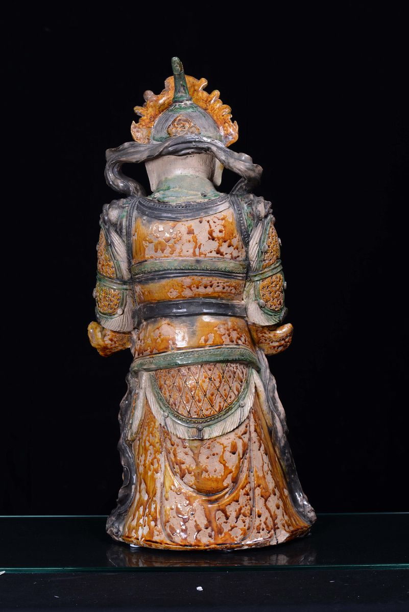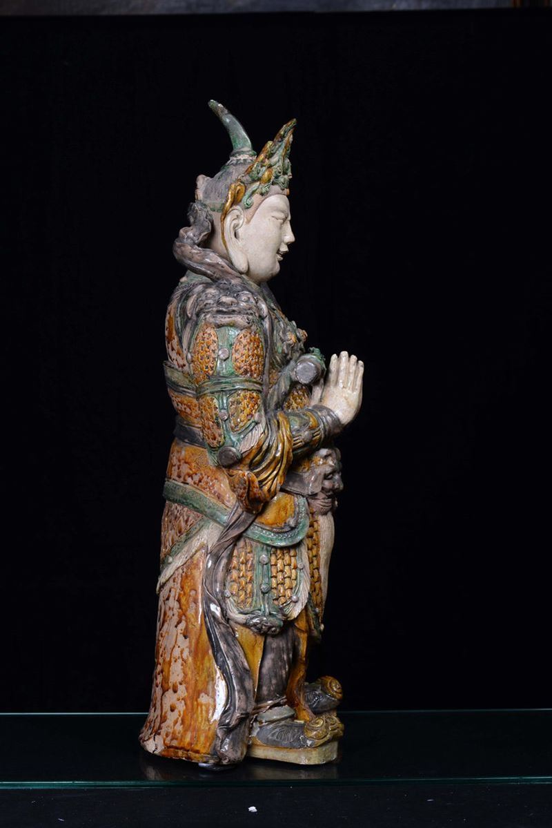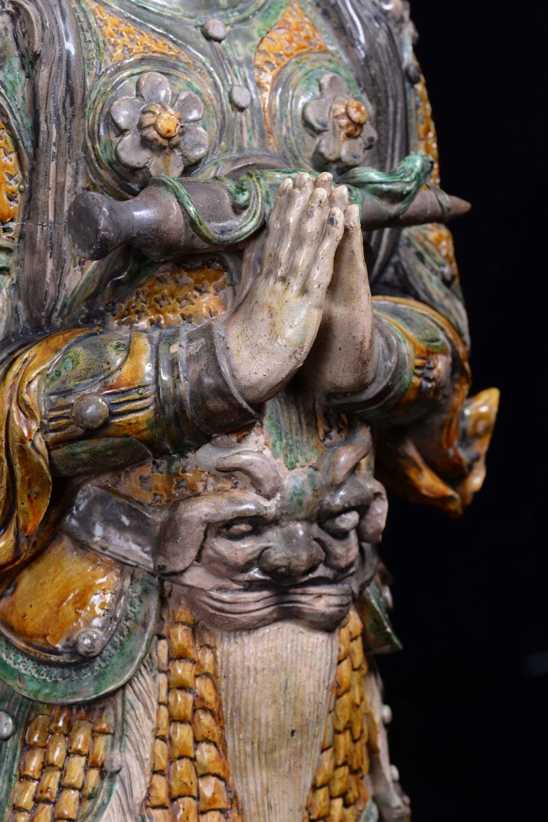 A large stoneware Guandi with polychrome enamel, China, Ming Dynasty, 16th century