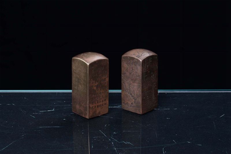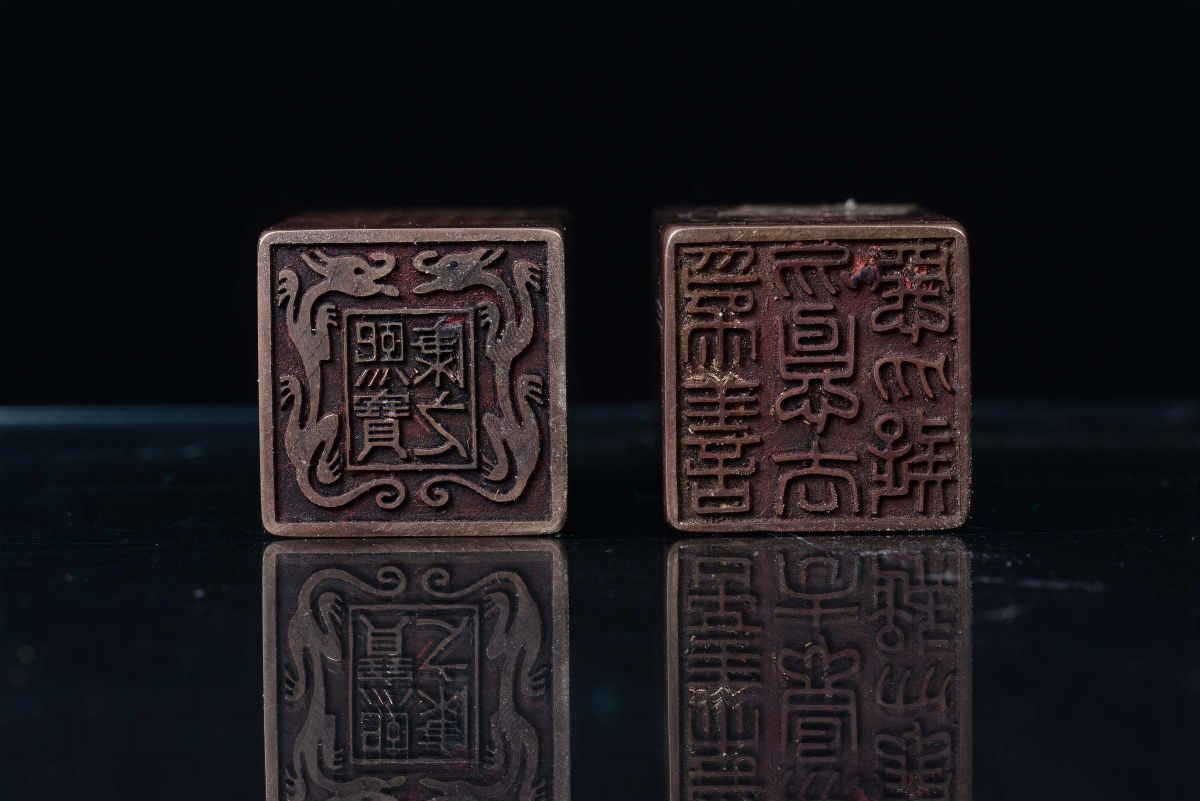 A pair of gilt bronze seals, China, Qing Dynasty, 19th centuryDecorations with ideograms on the sides