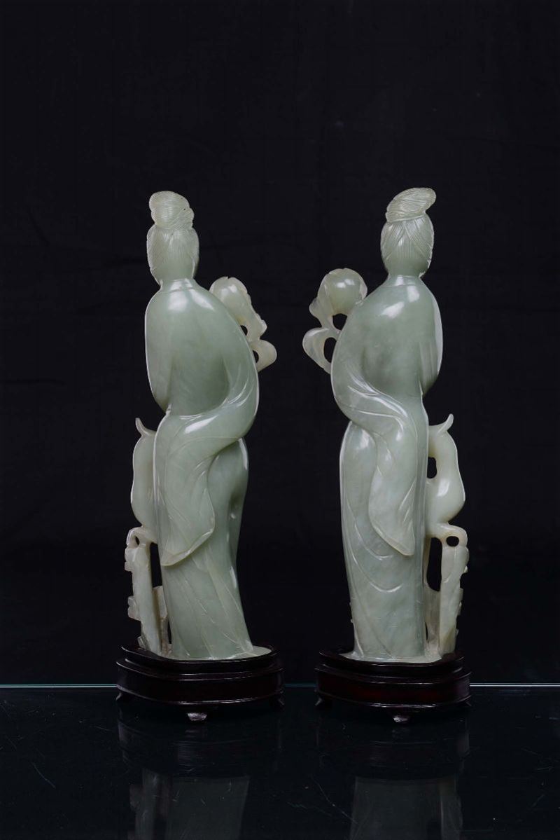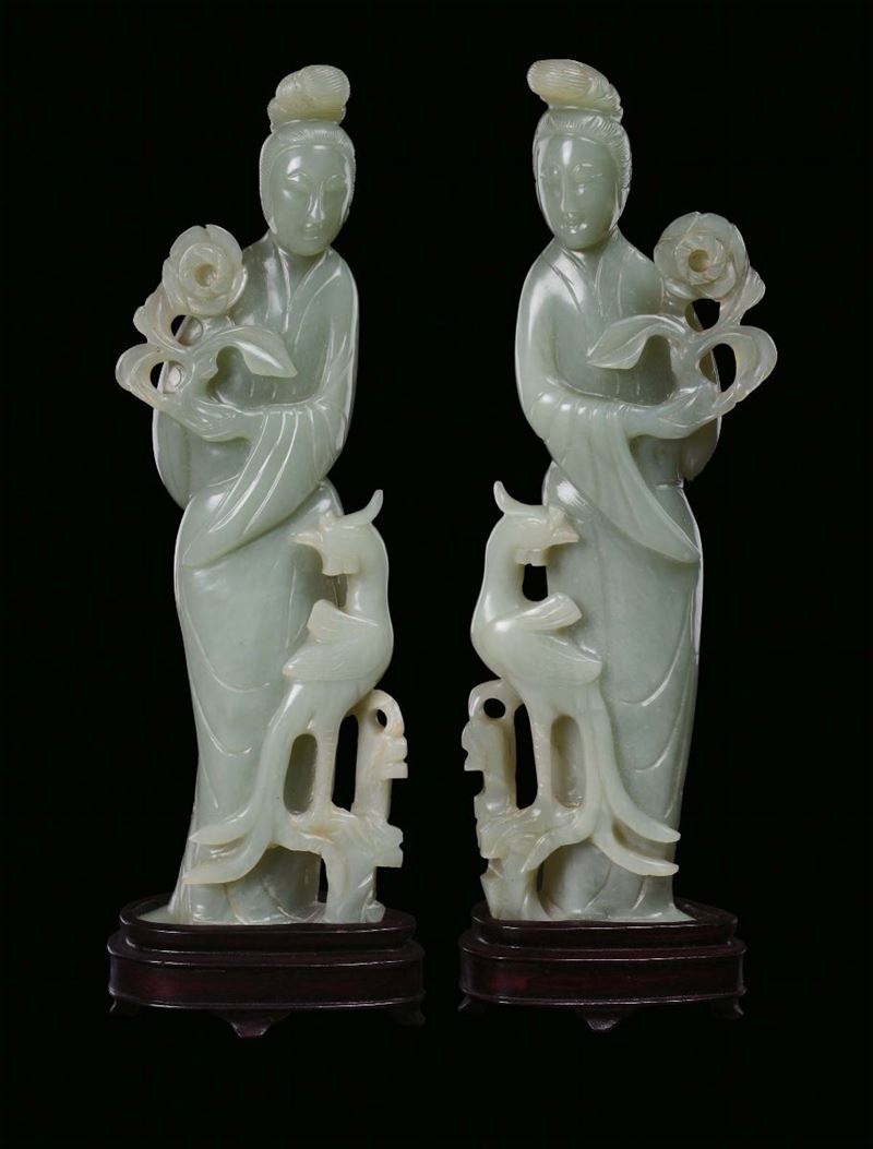 A pair of green jadeite Guanyin, China, Qing Dynasty, 20th century
