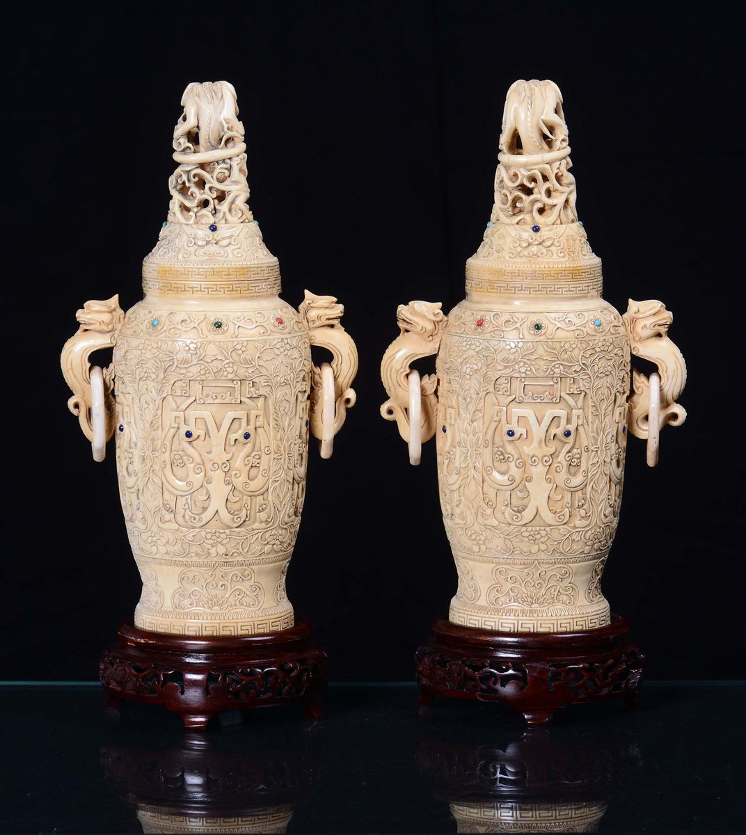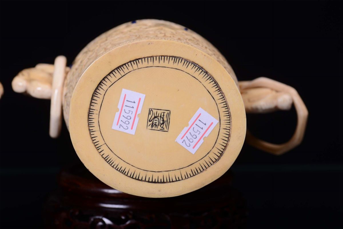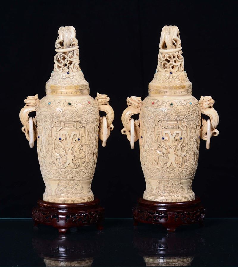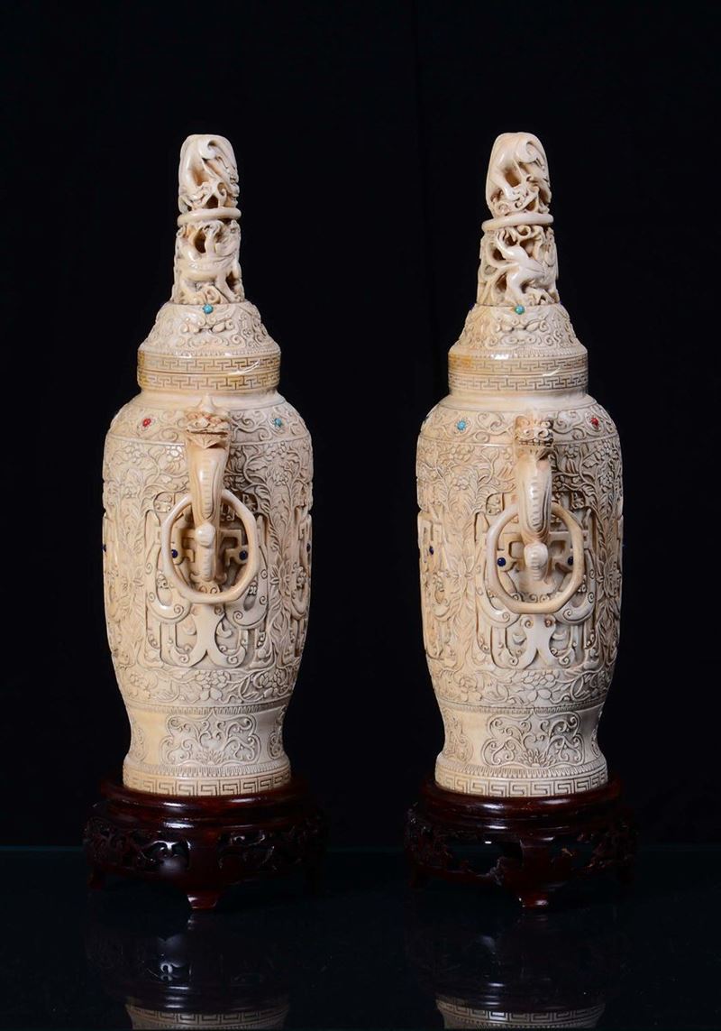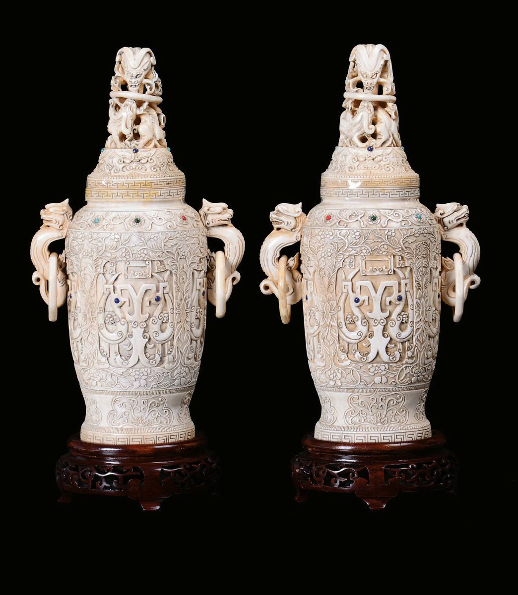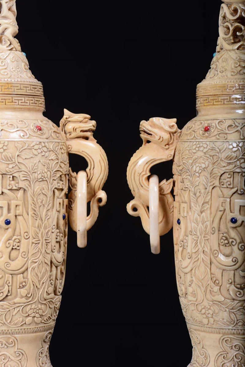 A pair of ivory vases sculpted with vegetable and floral motives, China, Qing Dynasty, 19th centuryApplication of gems, handles in the shape of imaginary animal