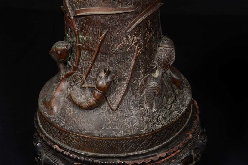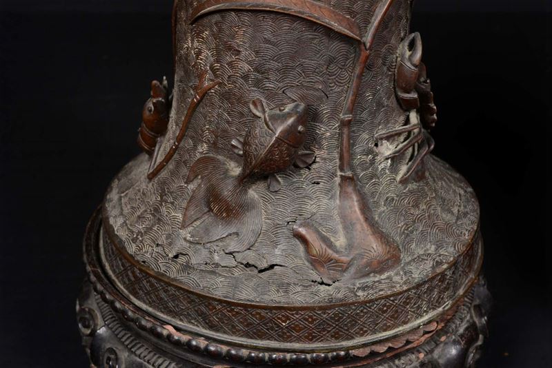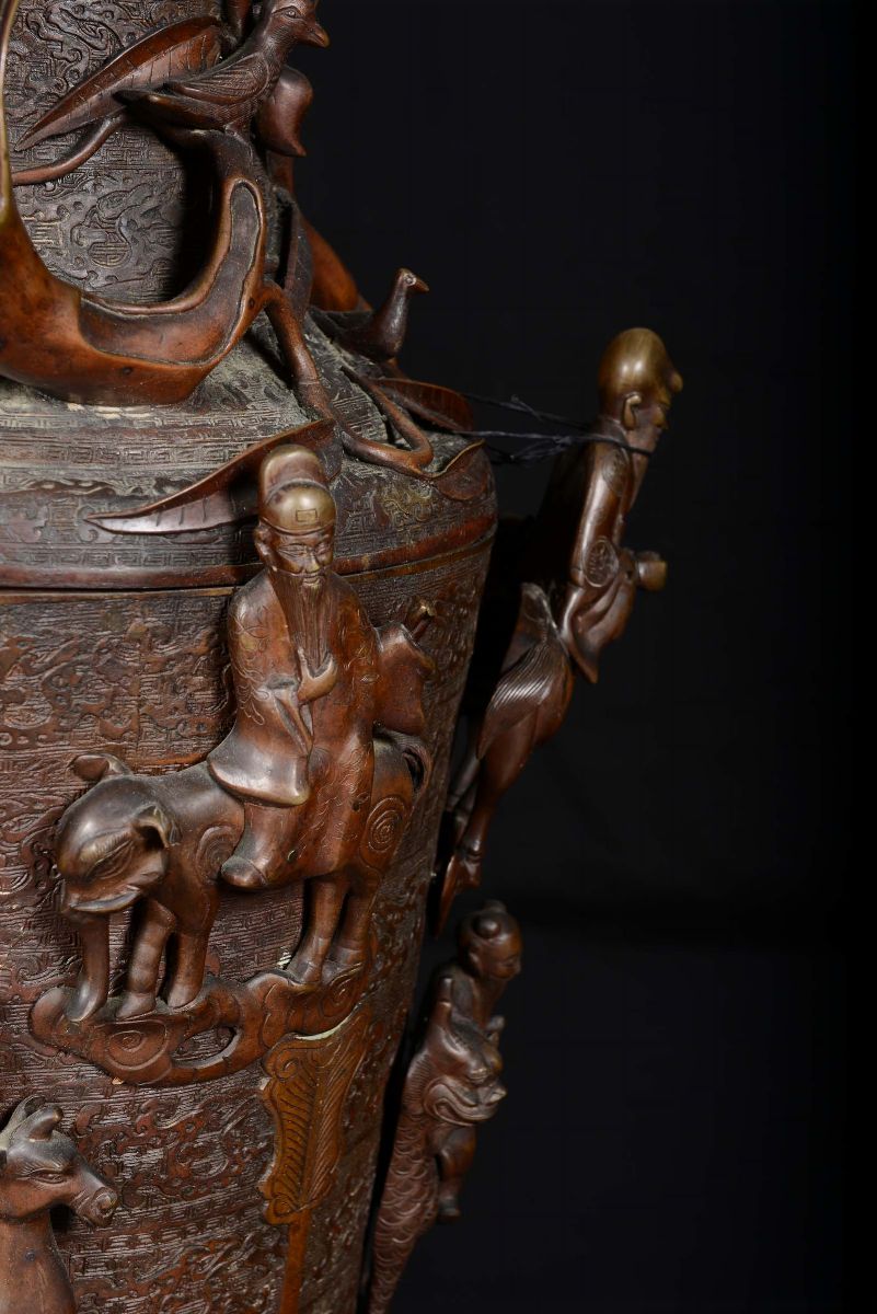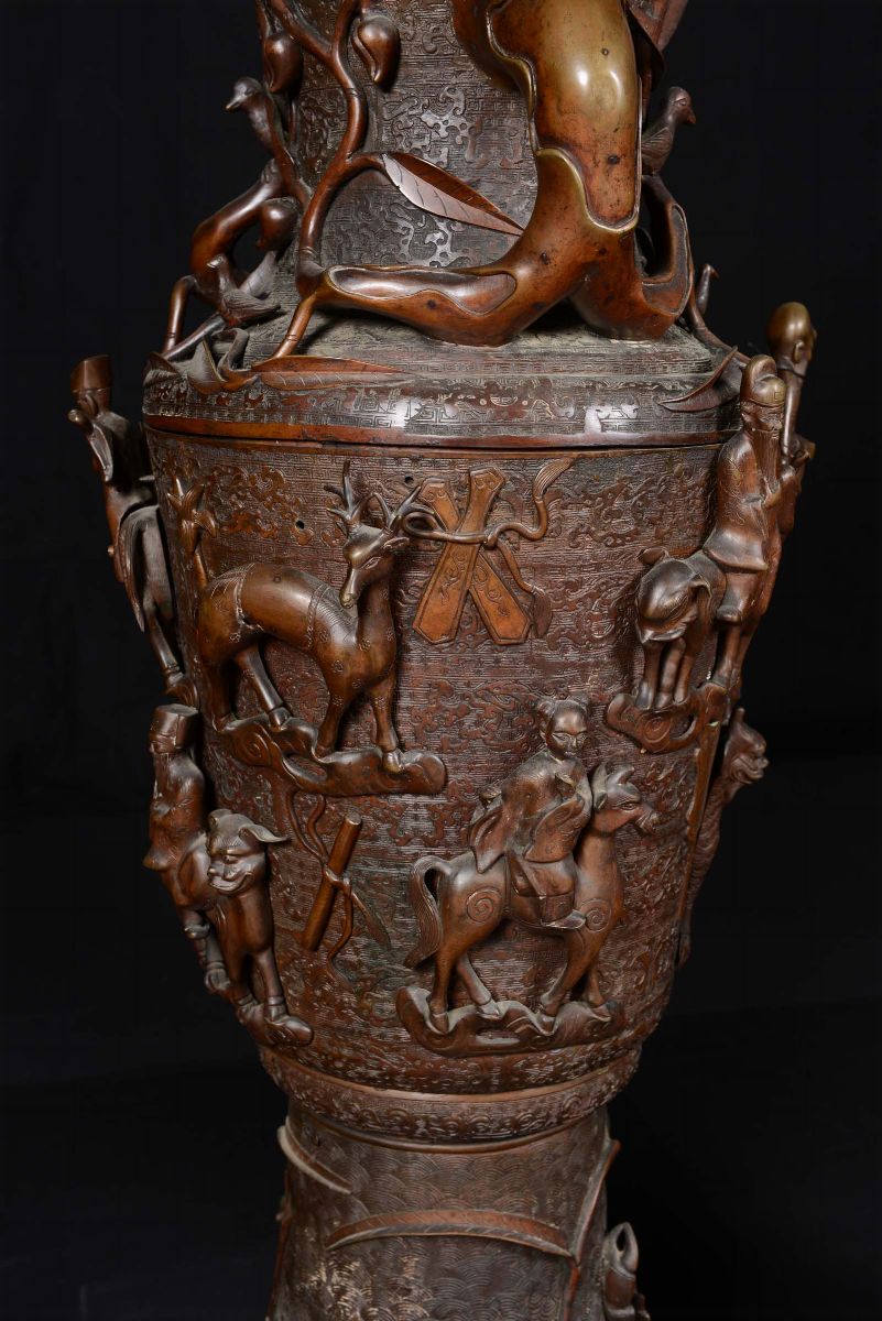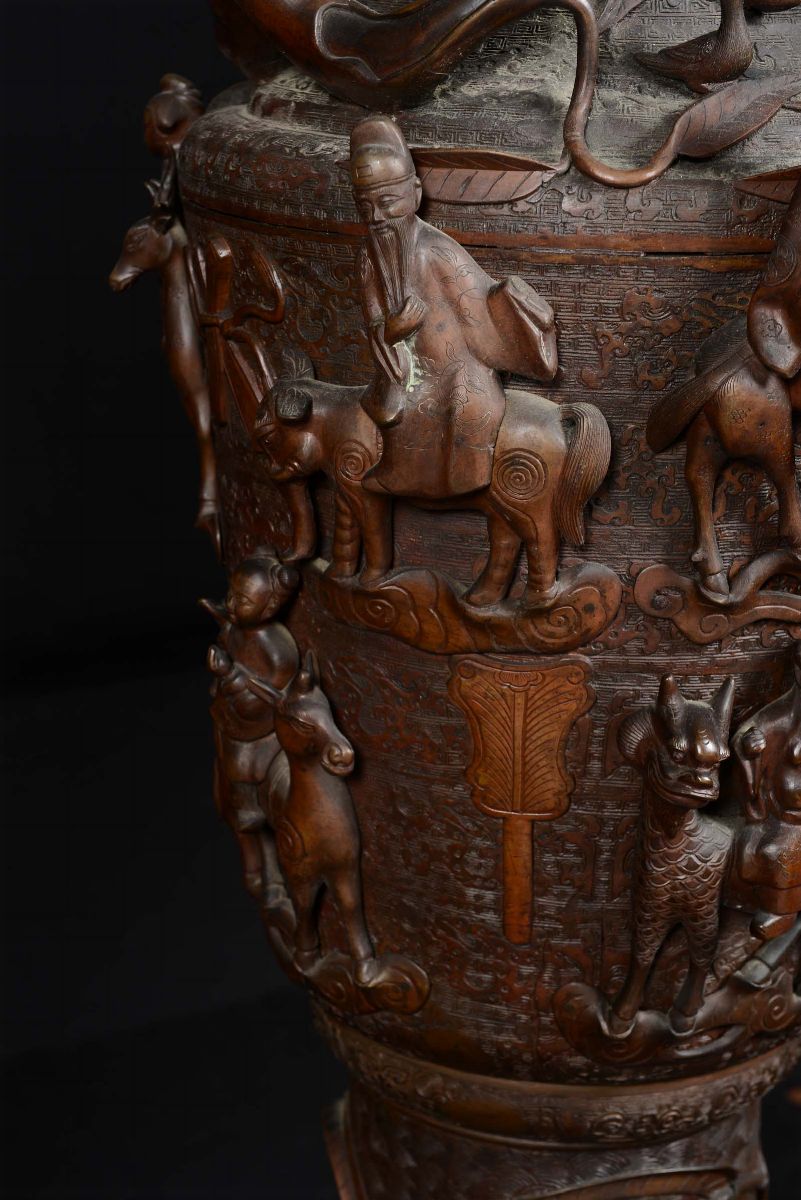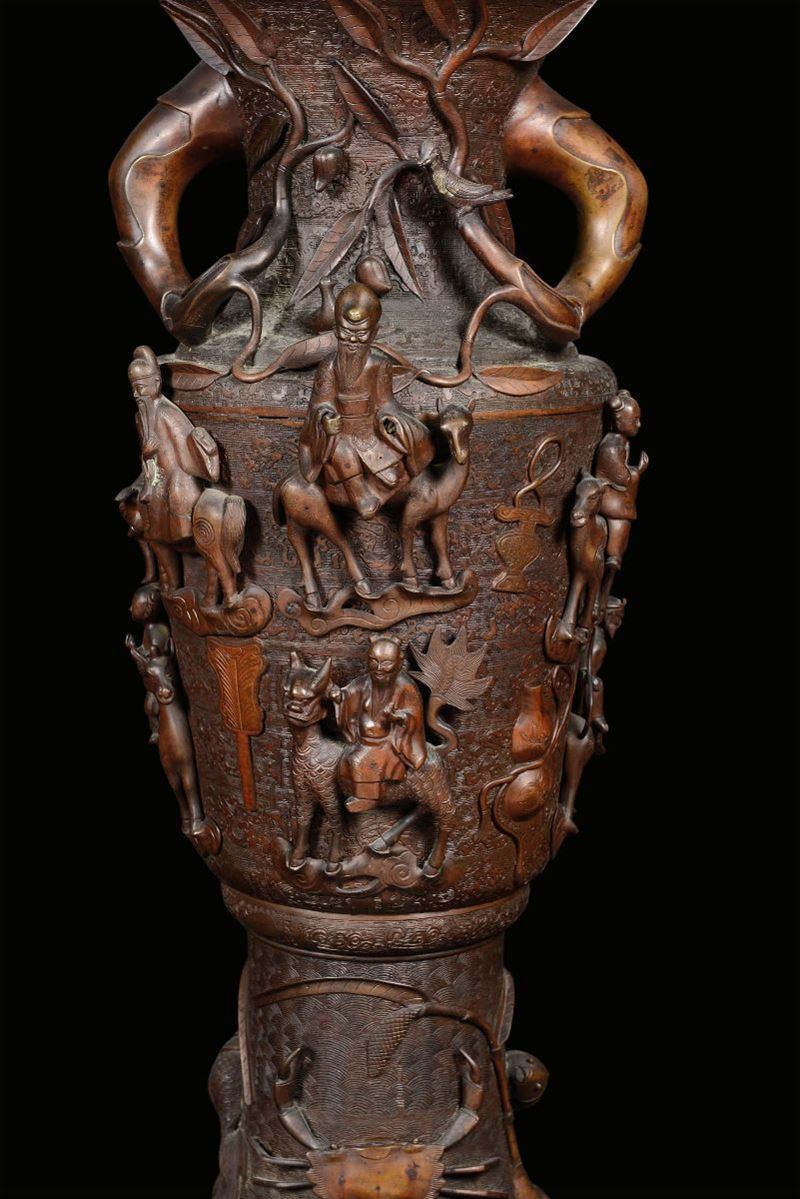 A pair of large bronze vases with dignitaries on horseback in rilief and marine elements, China, Qing Dynasty, Qianlong [..]