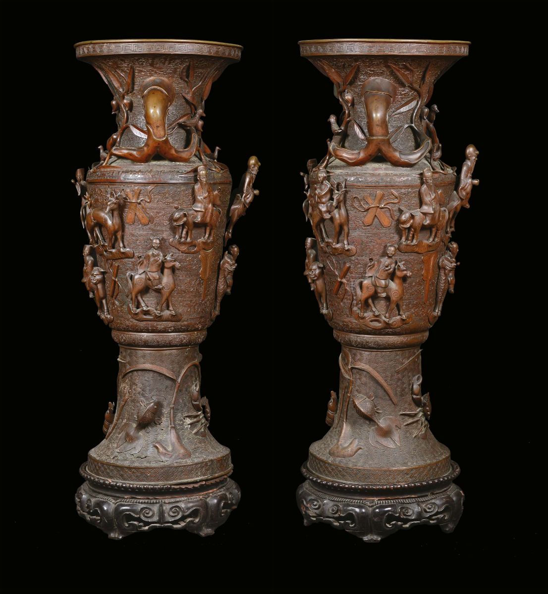A pair of large bronze vases with dignitaries on horseback in rilief and marine elements, China, Qing Dynasty, Qianlong Period (1736-1795)