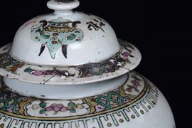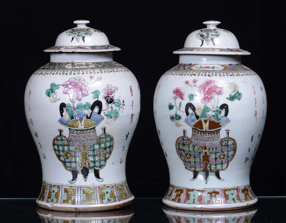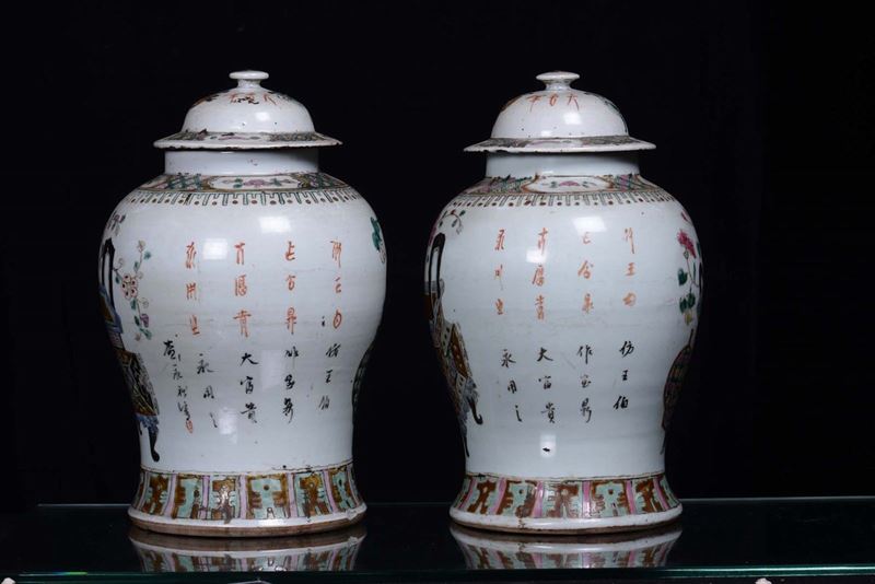 A pair of polychrome porcelain potiche, ideograms on the back, China 19th century