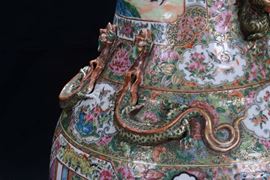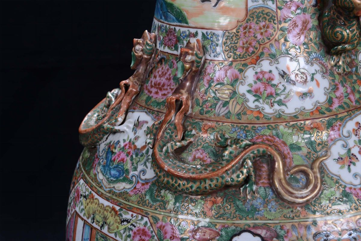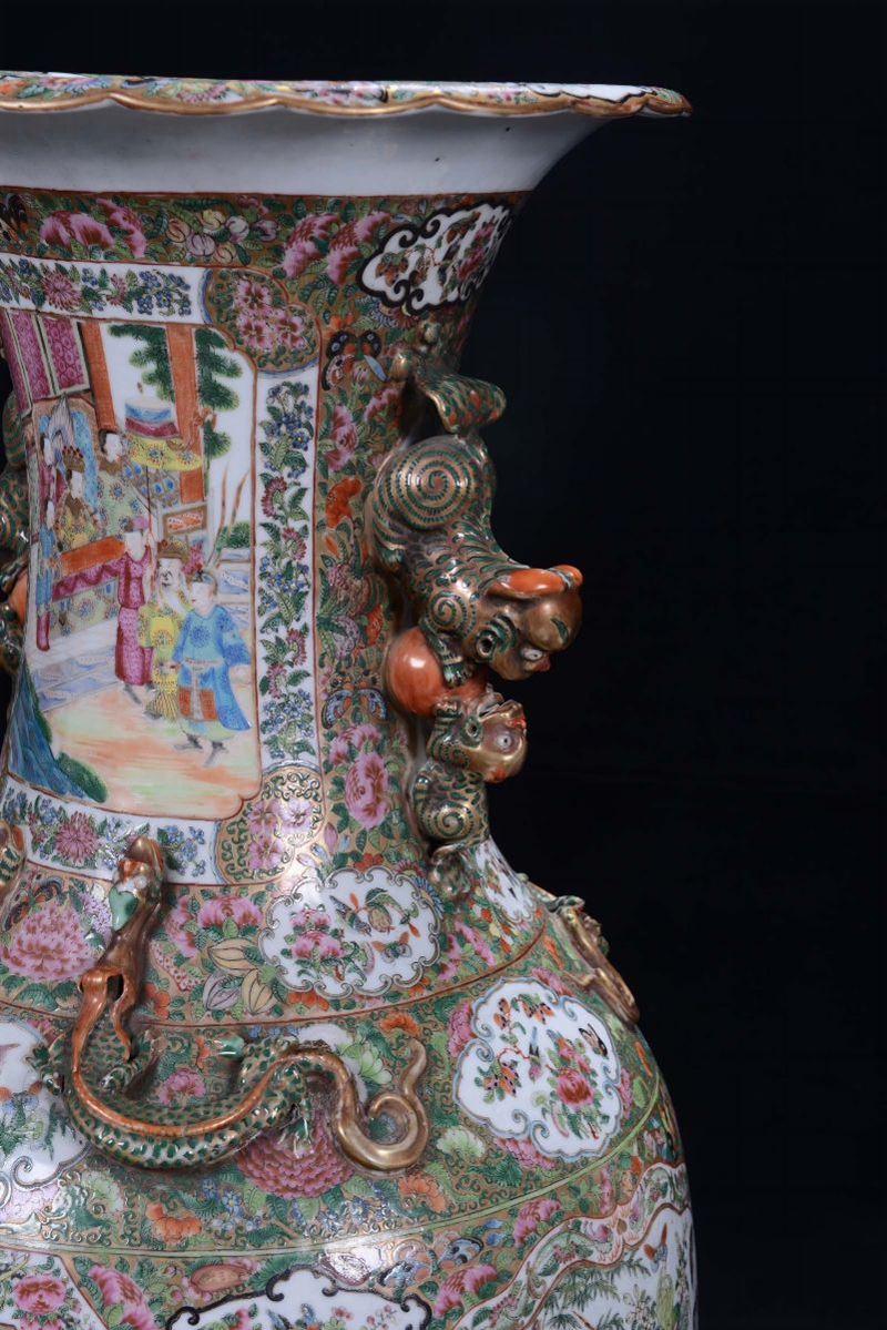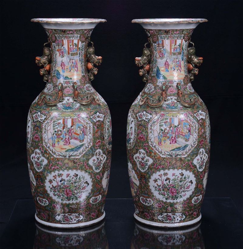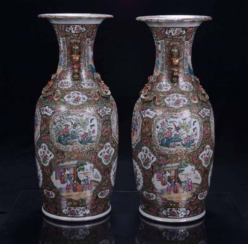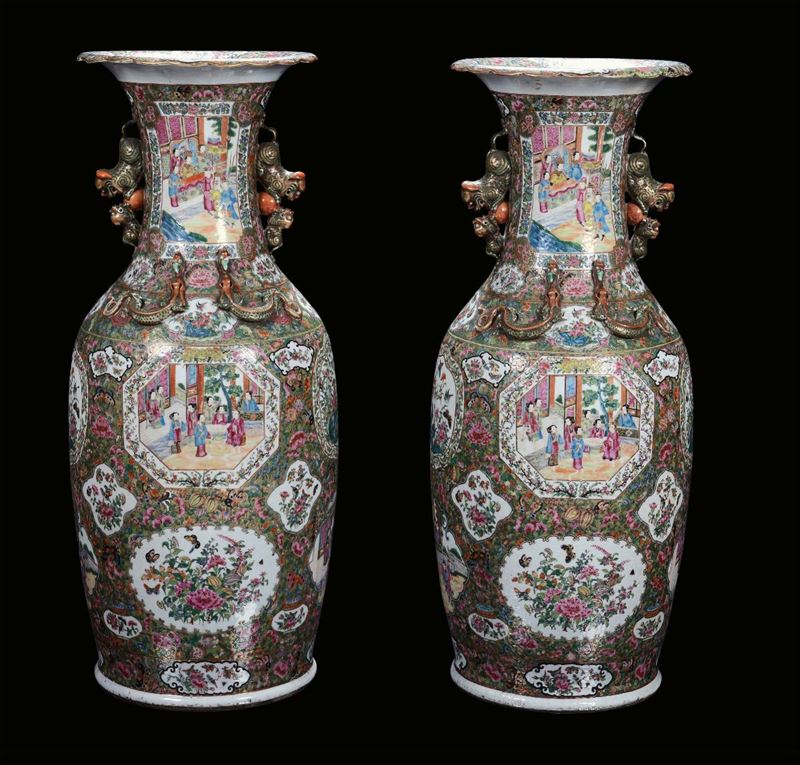 A pair of polychrome porcelain vases, Famille Rose, China, Canton, Qing Dynasty, 19th centuryDecoration with court life scenes