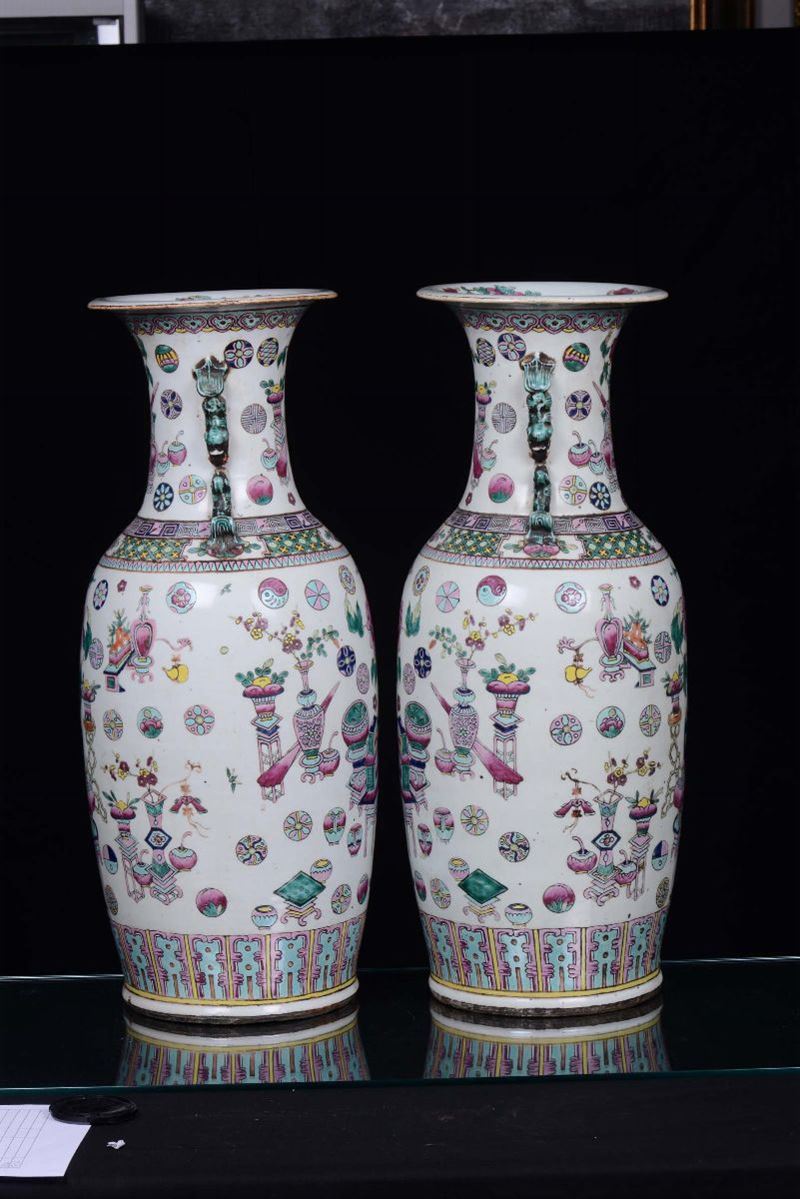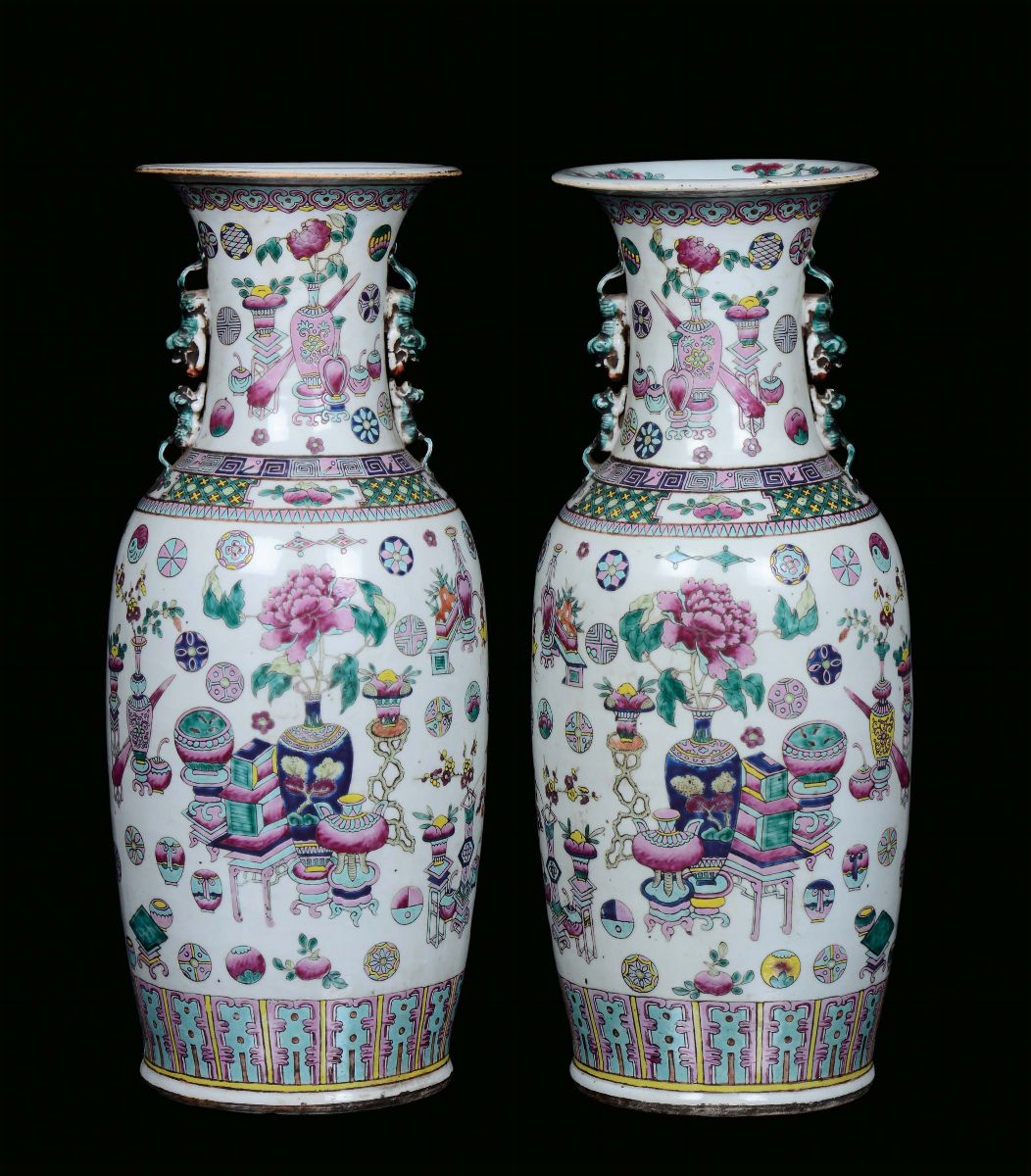 A pair of polychrome porcelain vases, Famille Rose, China, Qing Dynasty, 19th century Decorated with oriental objects, on the neck handles in the shape of a Pho dog