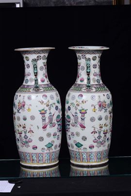 A pair of polychrome porcelain vases, Famille Rose, China, Qing Dynasty, 19th century Decorated with oriental objects, on [..]