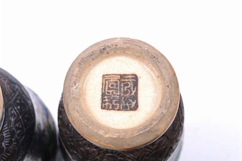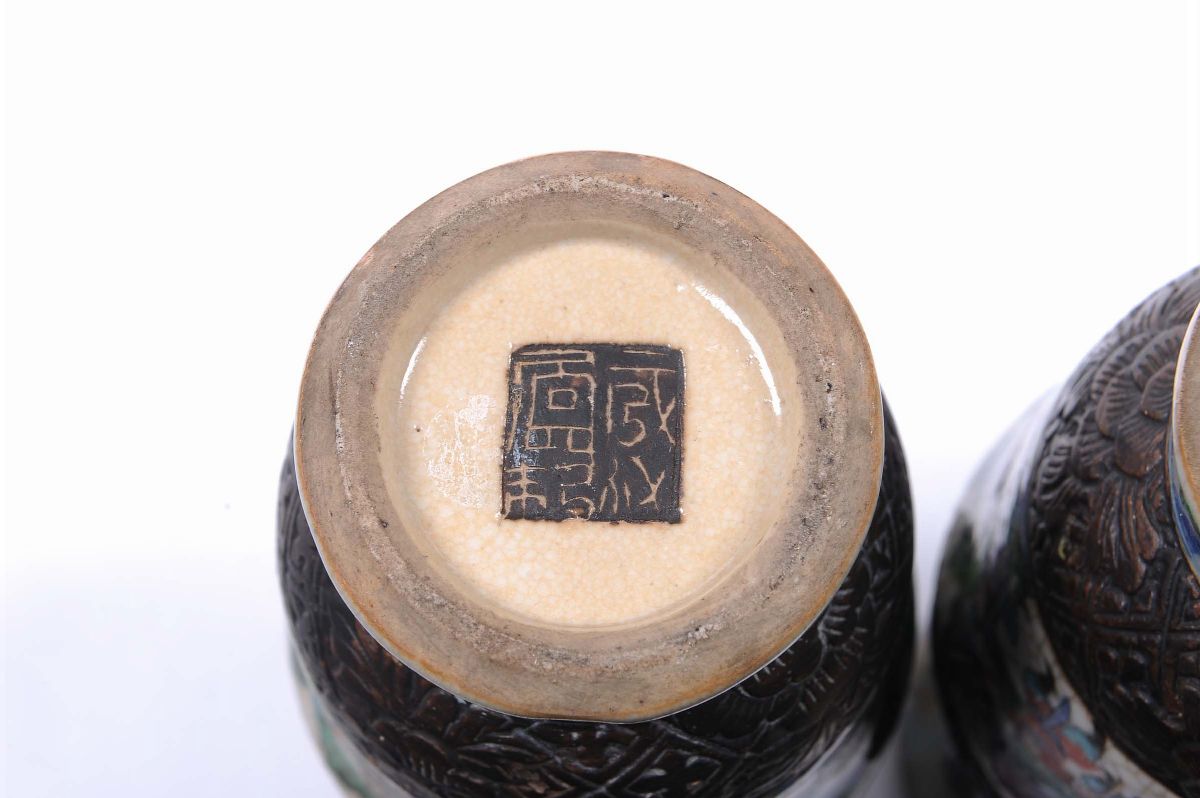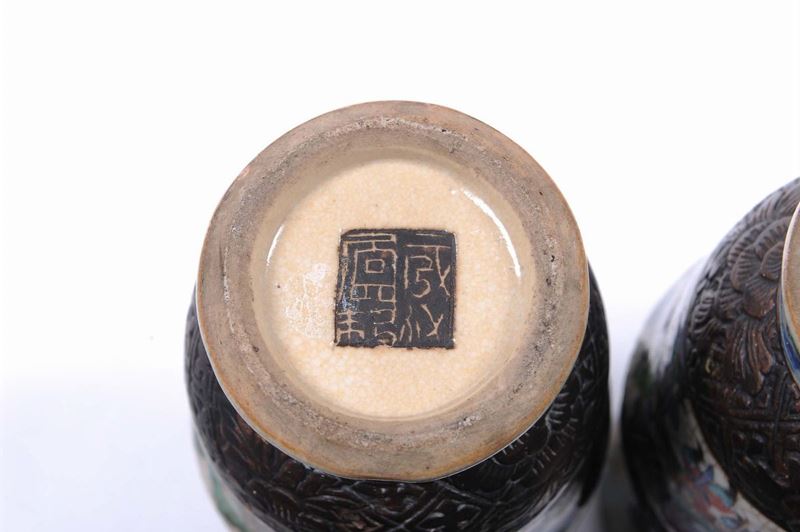 A pair of porcelain vases with polychrome battle scenes and relief decoration, Japan, 19th century