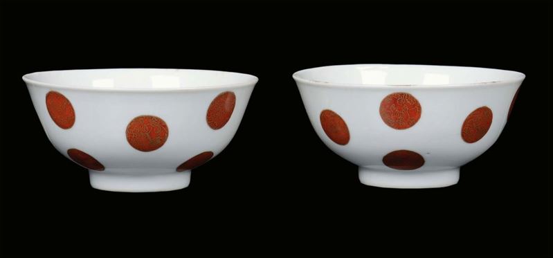 A pair of white porcelain bowls with red and gold rosette decoration, China, Qing Dynasty, Qiannlong Period ( 1736-1795) [..]
