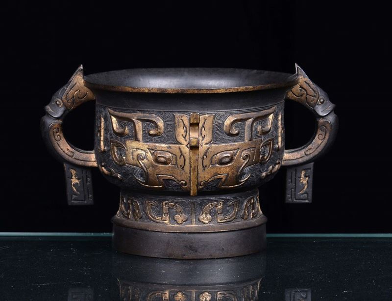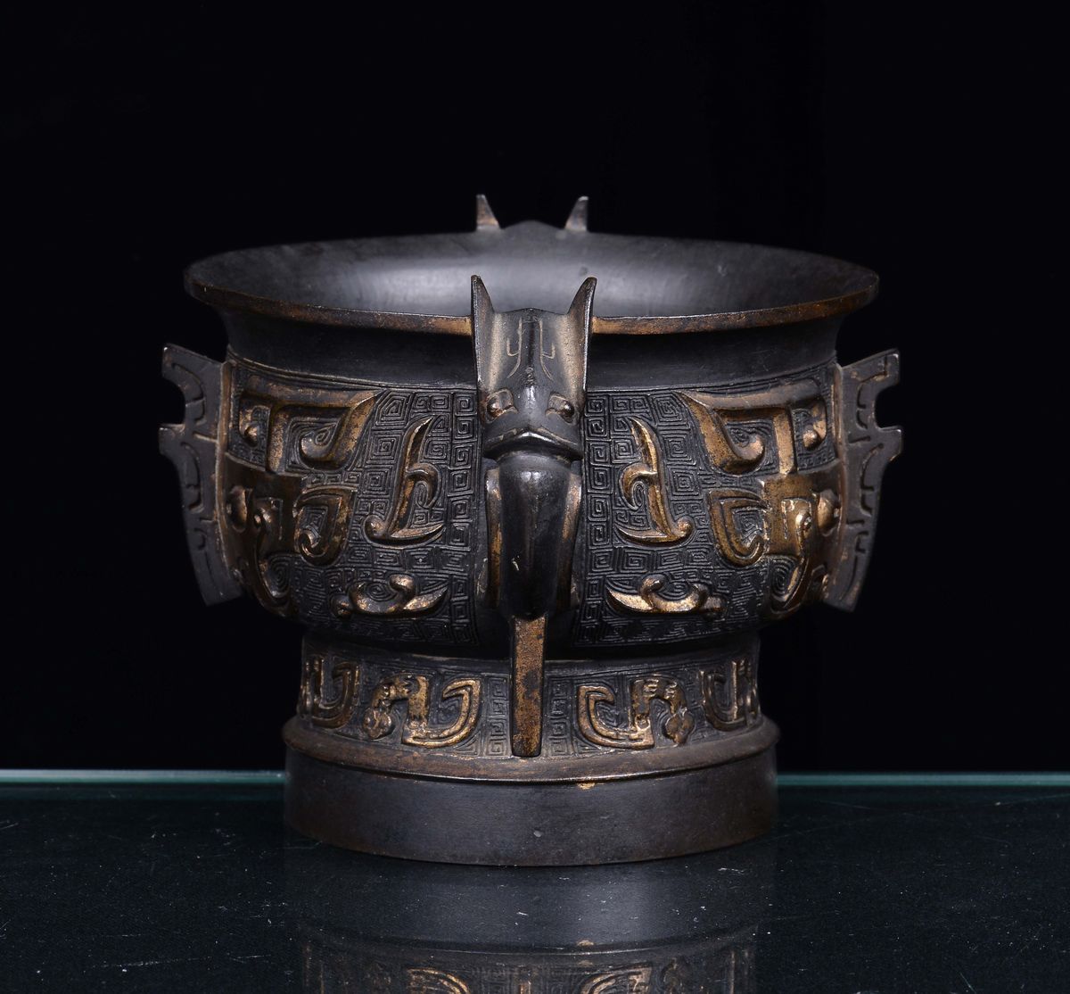 A partially gilt bronze censer or gui, archaic shape, China, Ming Dynasty, 17th centuryA similar sample is duplicated in a 1749 print on the annals of the Imperial Palace in Beijing during the Qianlong Reign.The same censer without gold plate is preserved at the Victoria and Albert Museum in London