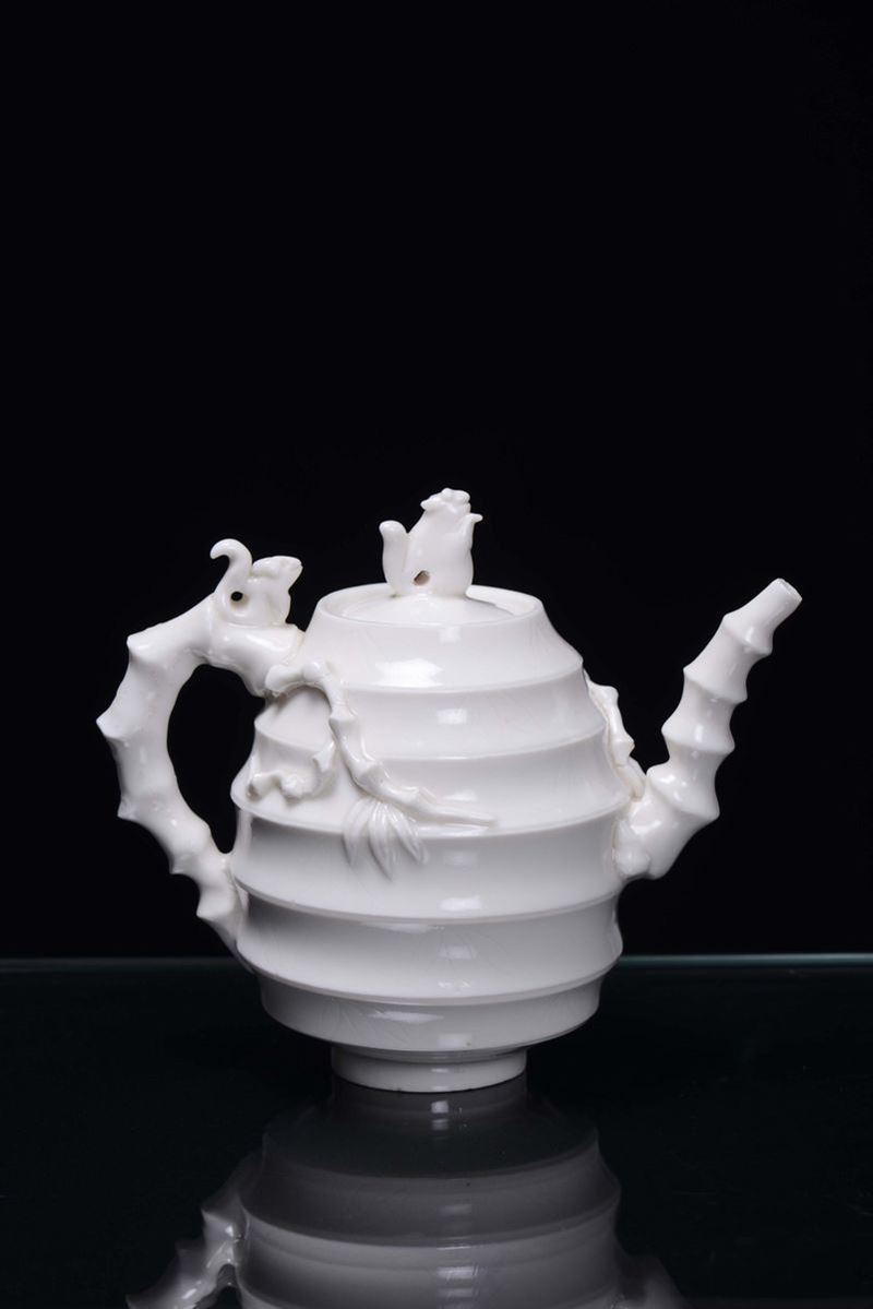 A rare Blanc de Chine porcelain teapot decorated with squirrel and bamboo, China, Dehua, Qing Dynasty, end 17th century
