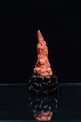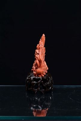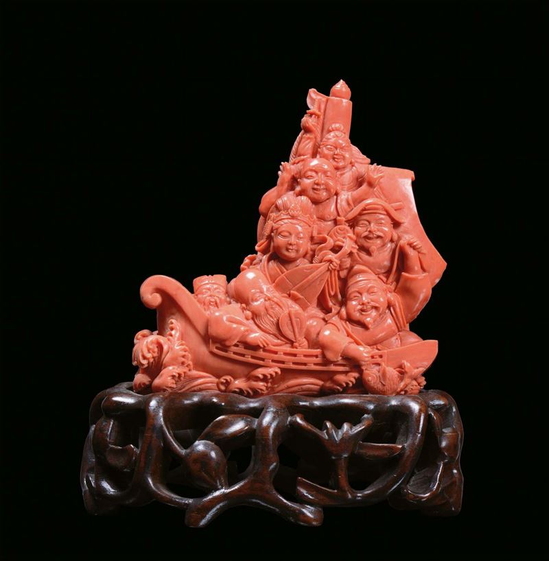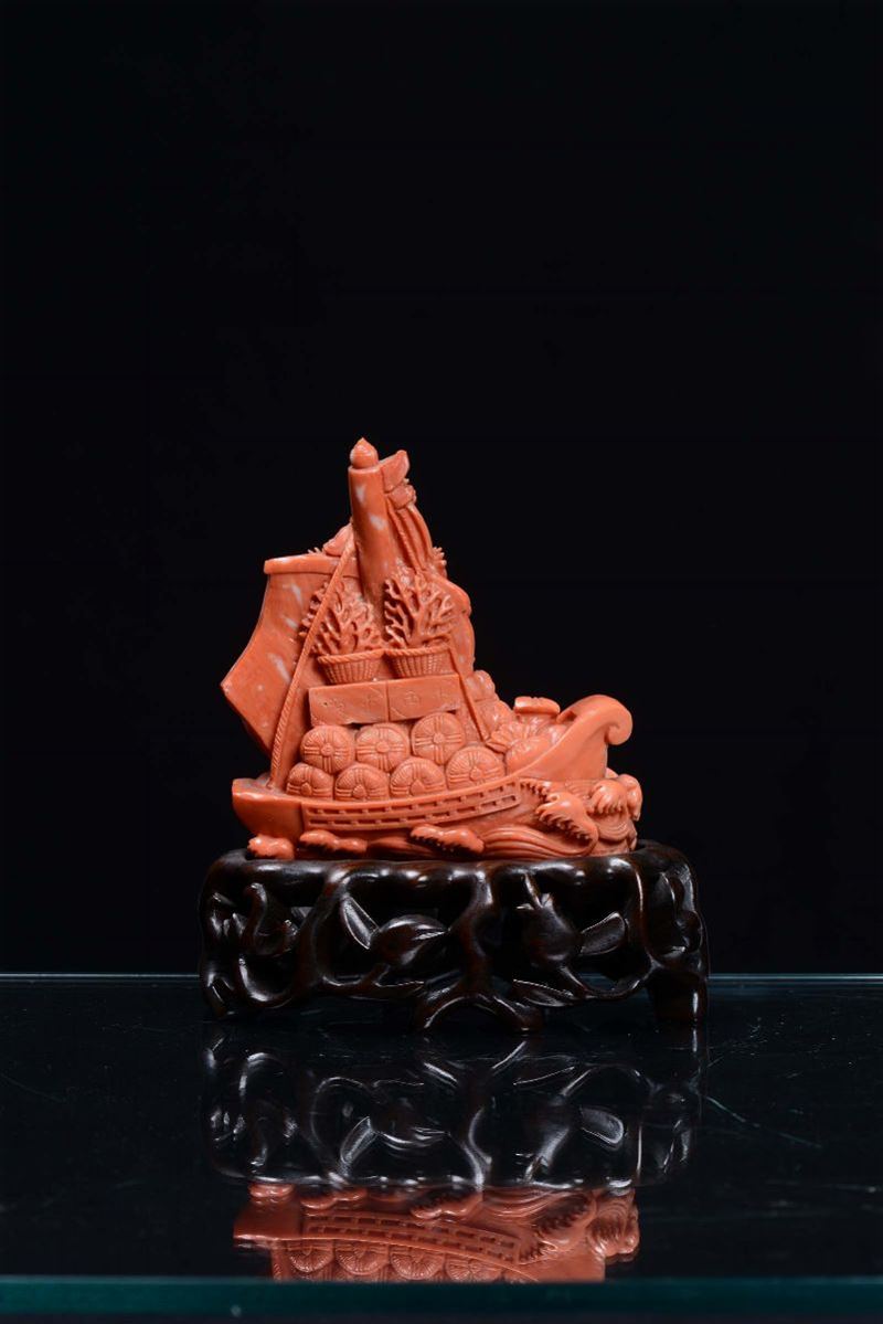 A red coral group sculpted with musicians on a boat, China, Qing Dynasty, 19th century