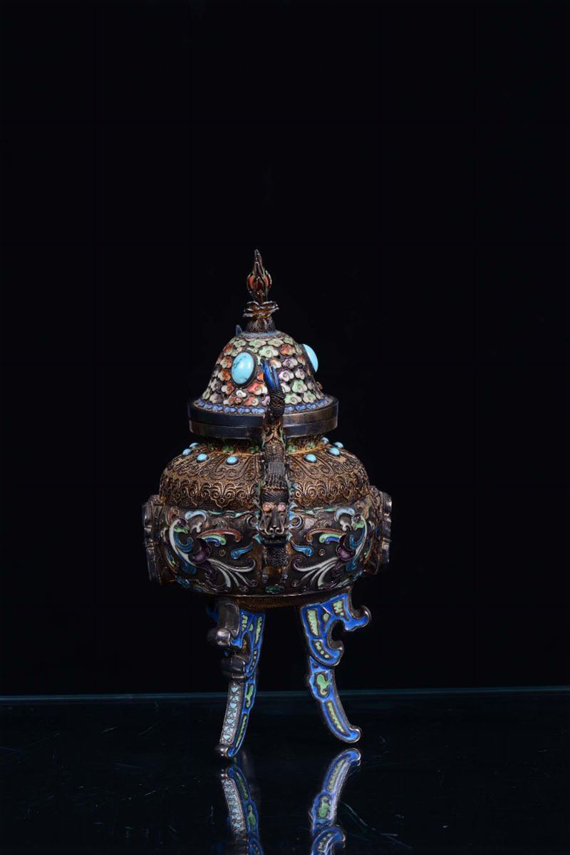 A silver, enamel and filigree censer with application of gems and jades, China, Qing Dynasty, 19th centuryHandles in the [..]