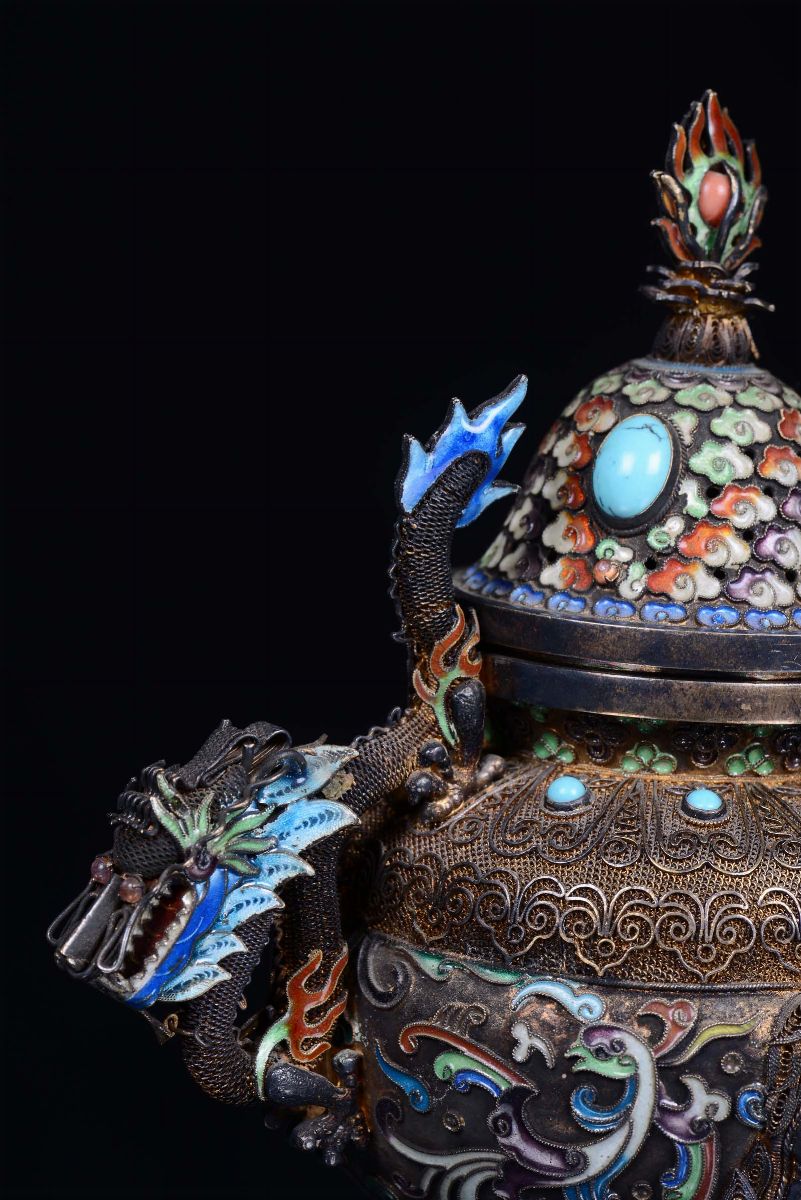 A silver, enamel and filigree censer with application of gems and jades, China, Qing Dynasty, 19th centuryHandles in the shape of dragon