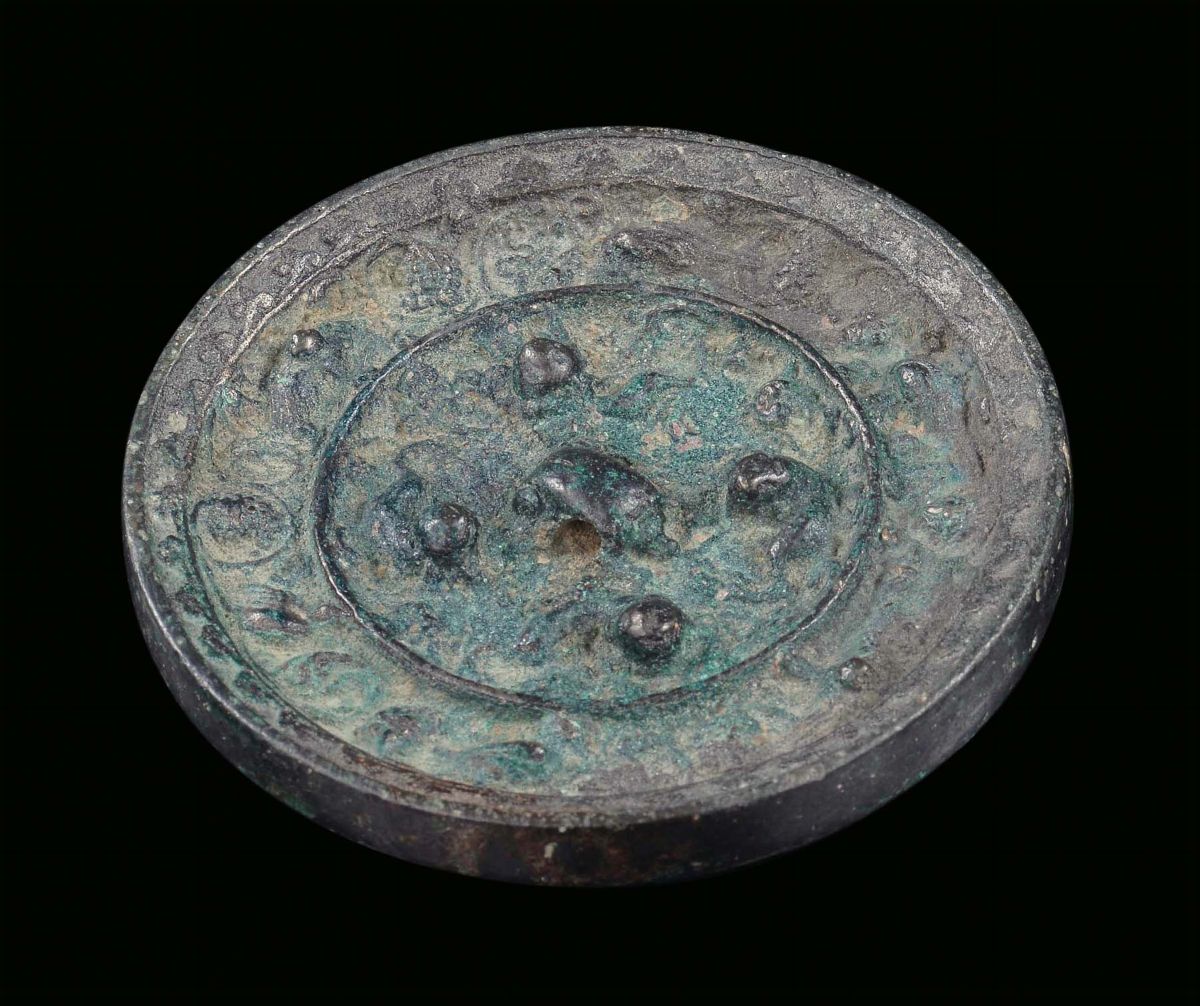 A silver-plated bronze mirror, China, Han Dynasty, 2nd centuryDecorations with lions, birds and grapes