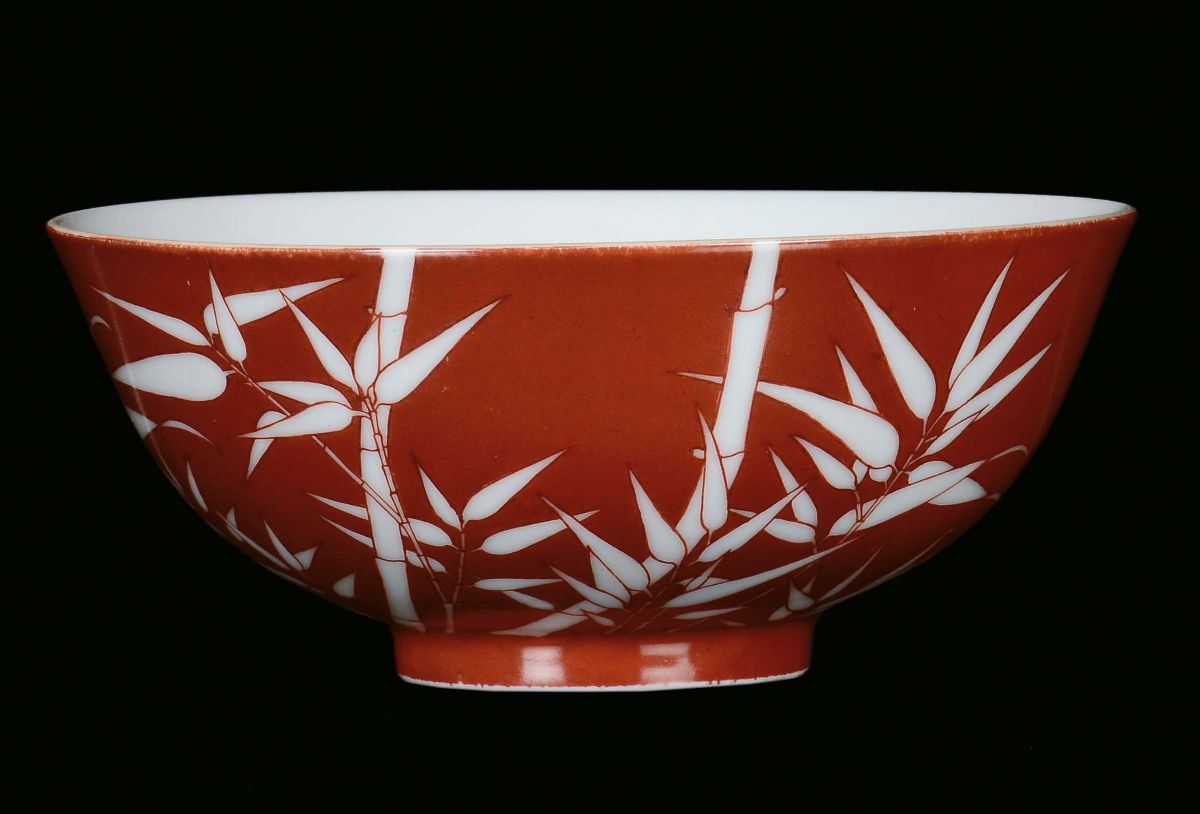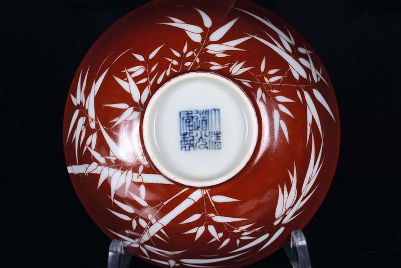 A small porcelain bowl with orange background and bamboo, China, Qing Dynasty, Daoguang Period (1821-1850)