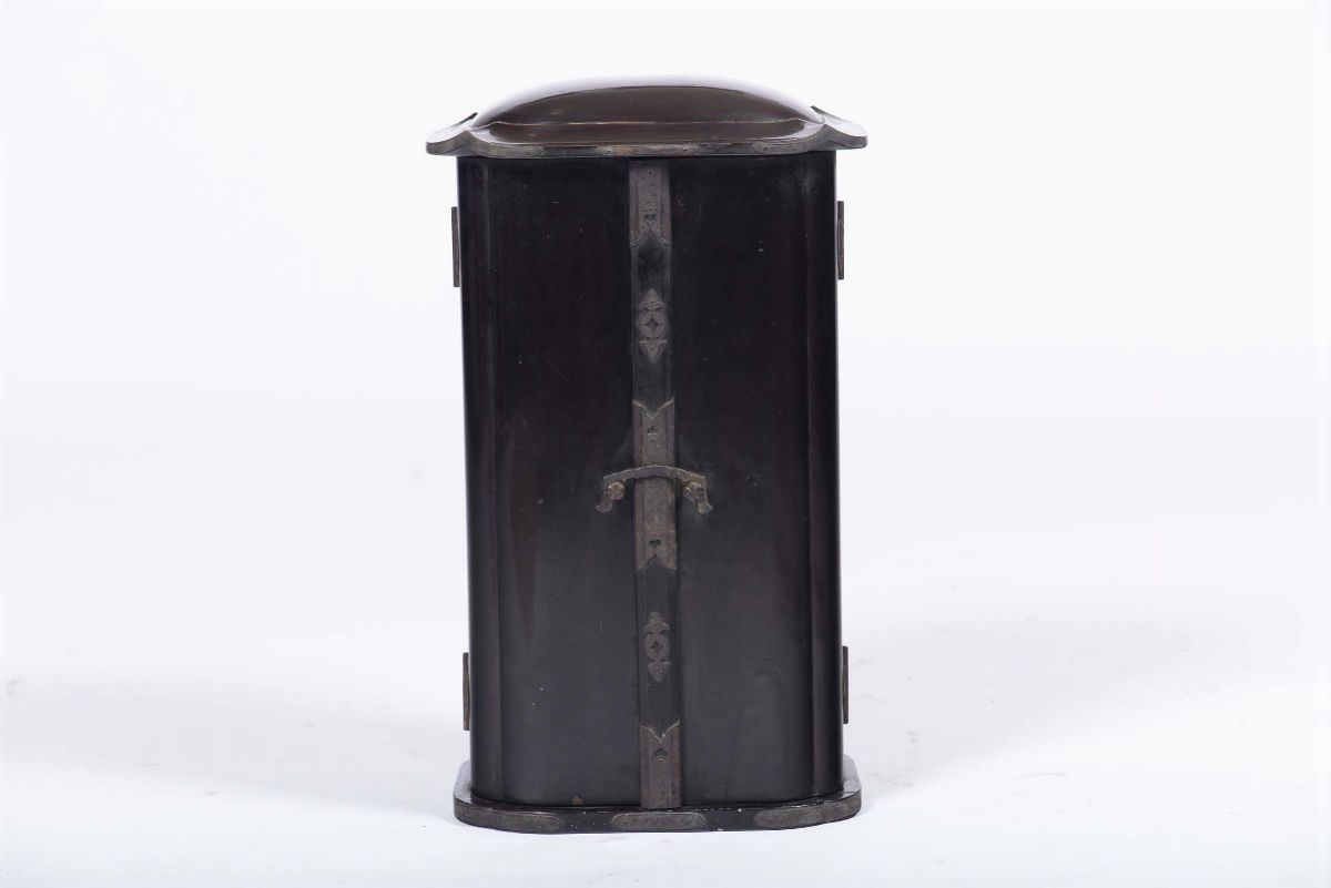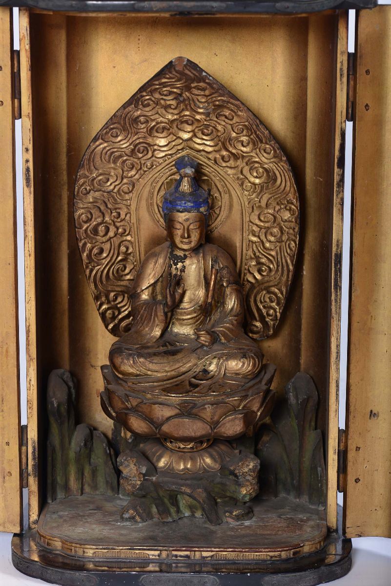 A small travel lacquered wooden temple with carved divinity, Japan, 19th century