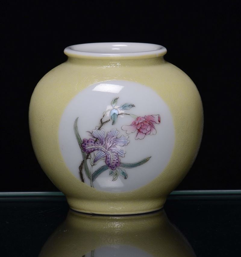 A small yellow porcelain vase with polychrome floral decoration, China, 20th centuryMark and the period