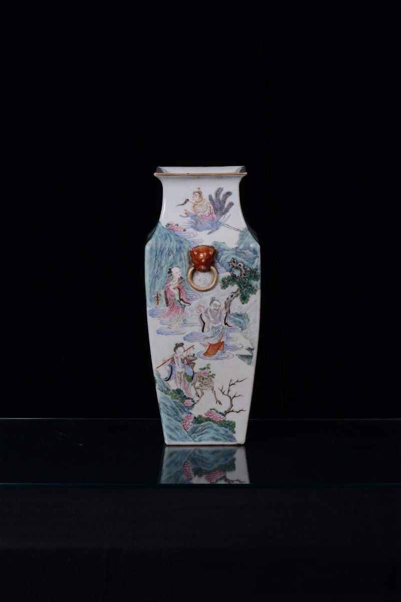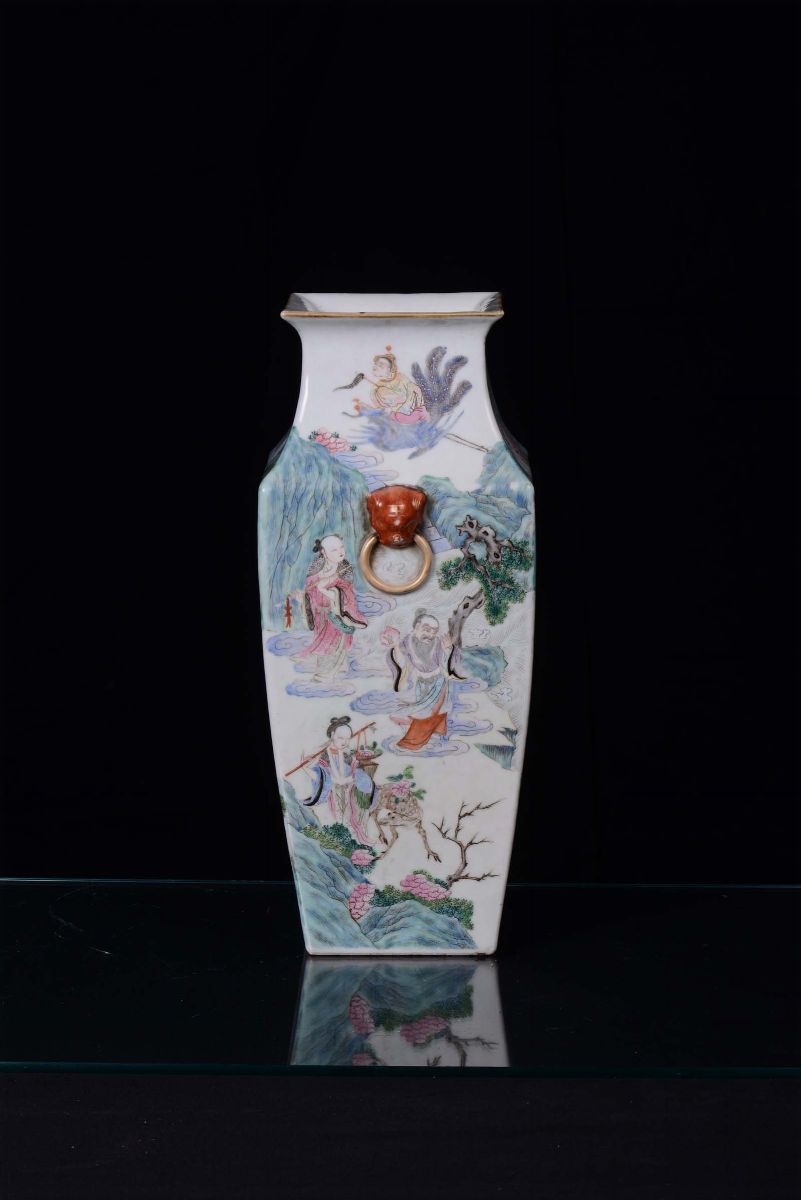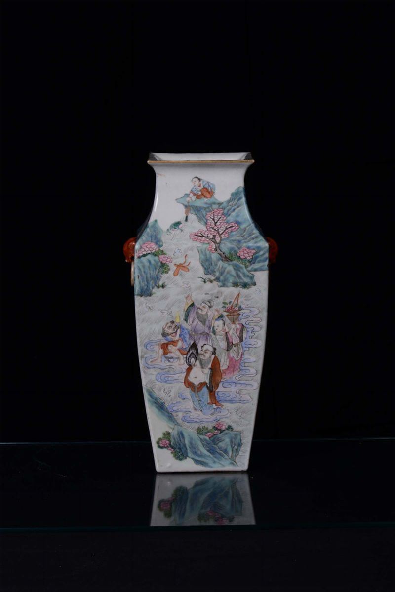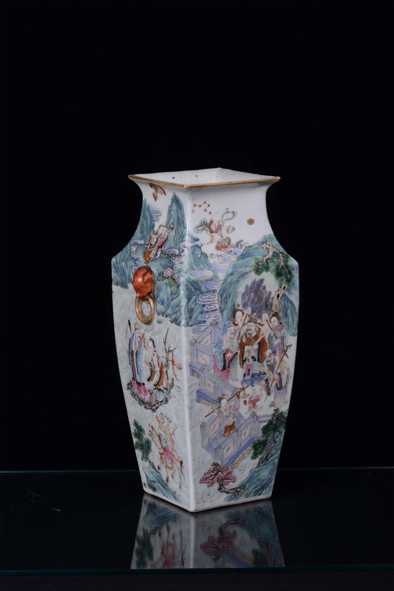 A squared section porcelain vase, China, Qing Dynasty, end 19th centuryPolychrome decoration with landscapes and figures