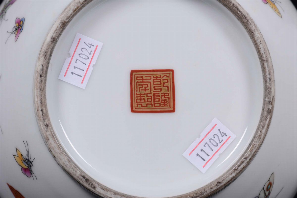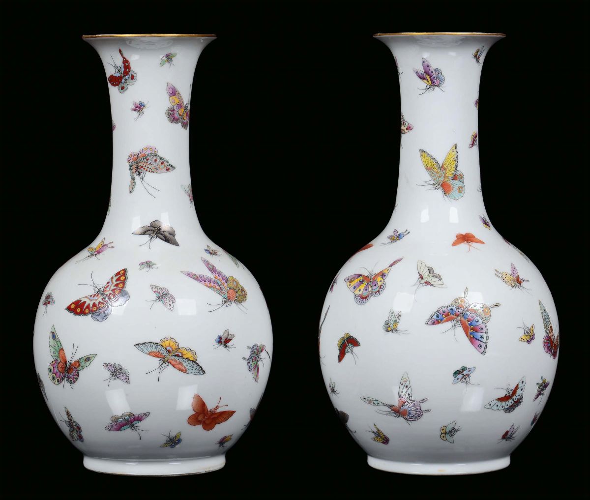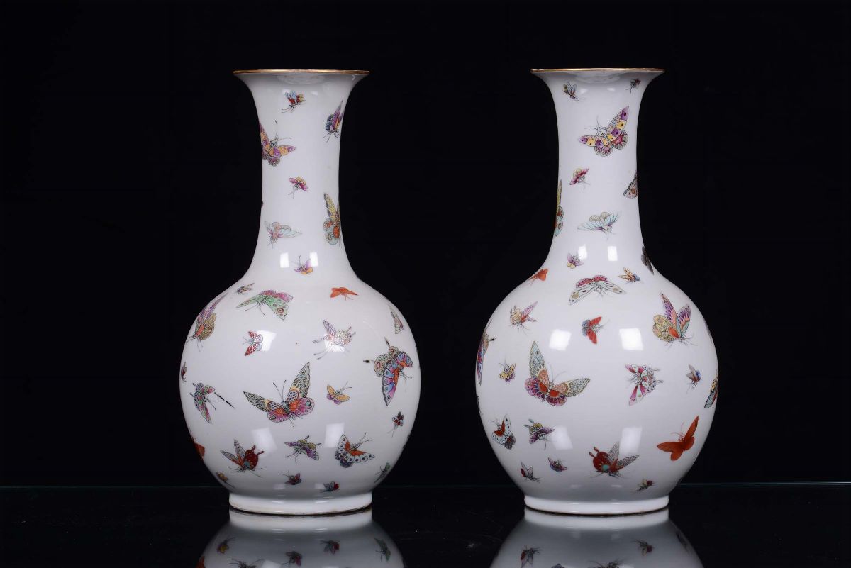 Pair of polychrome Pink Family porcelain vases with butterfly decoration, China, Qing Dynasty, 19th century