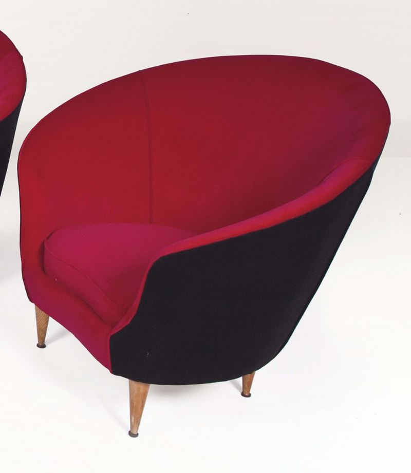 Coppia di poltrone con rivestimenti in tessuto e supporti in legno. Prod. Italia, 1950 ca. cm 80x75x74