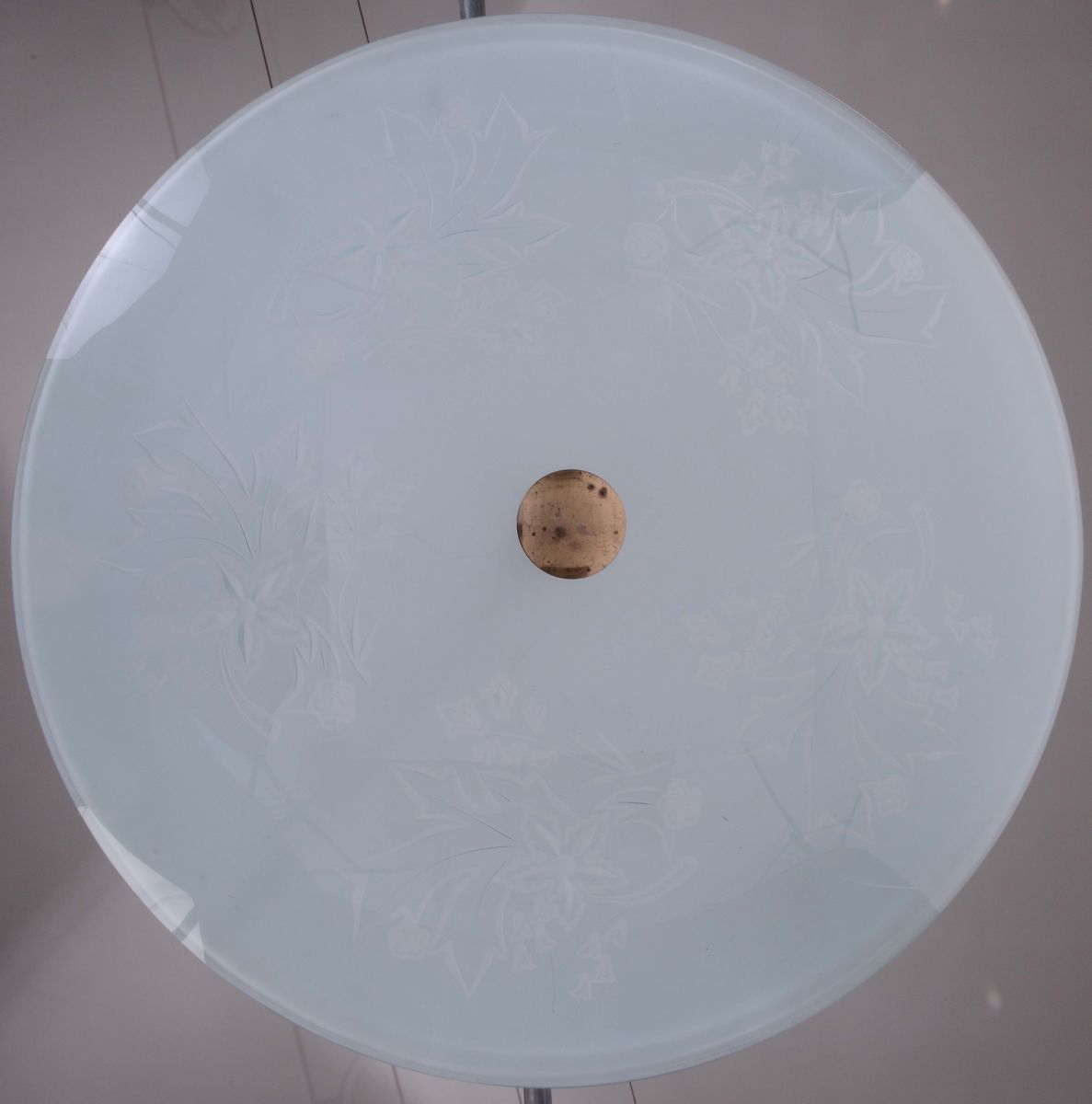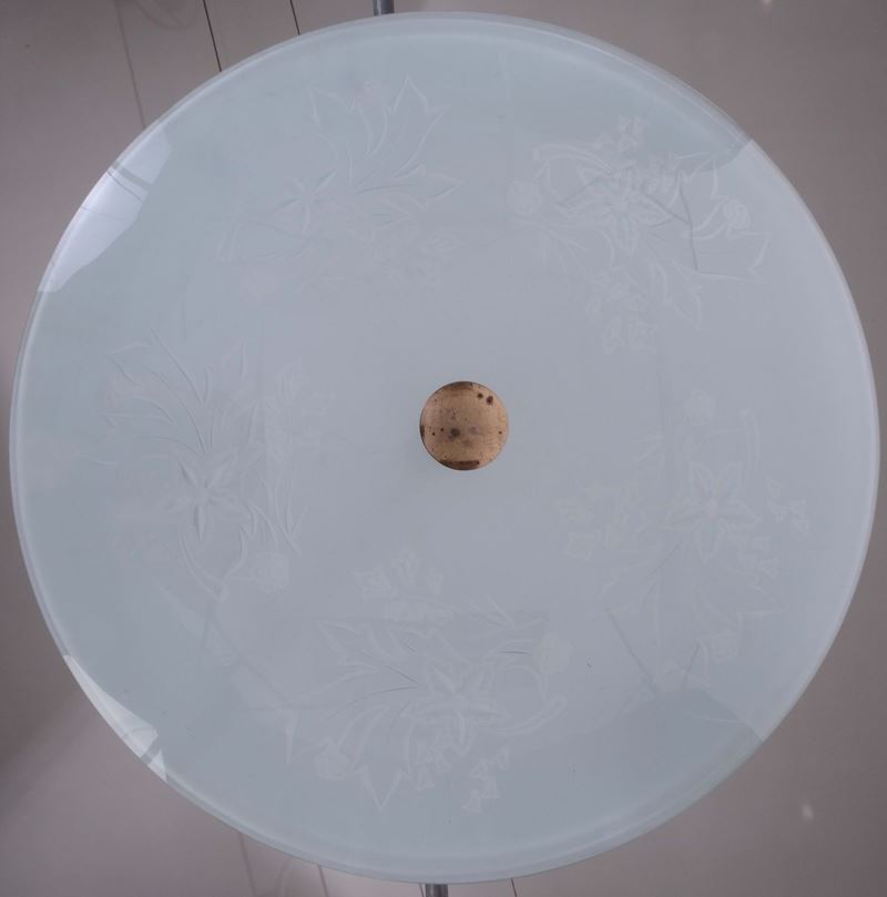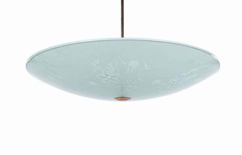 Lampada a sospensione con diffusore in cristallo curvato decorato con motivi floreali. Tecnica di lavorazione a getto di sabbia e molatura. Prod. Fontana Arte, Italia, 1940 ca. cm 80x70