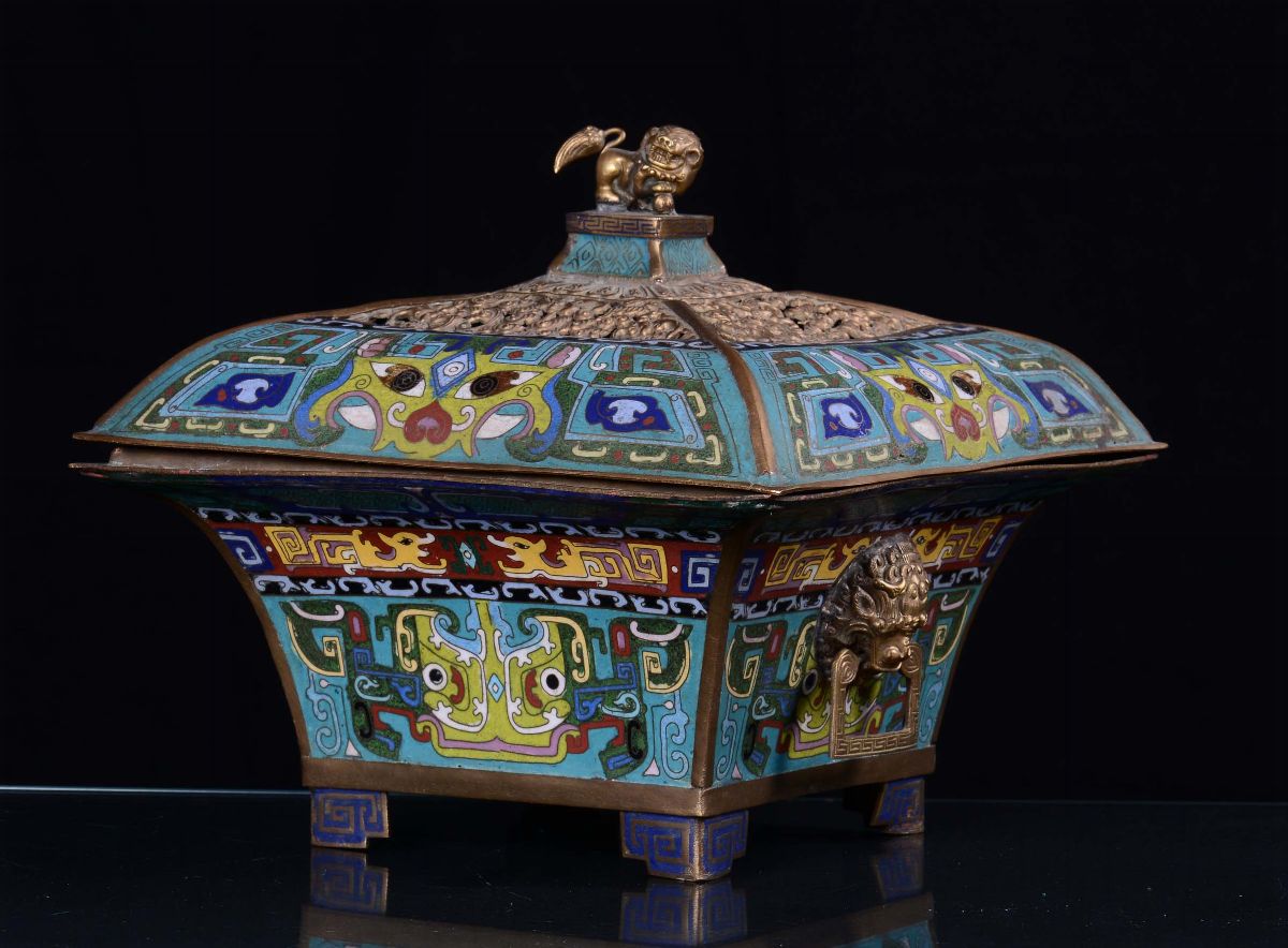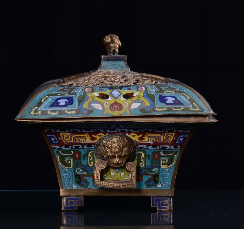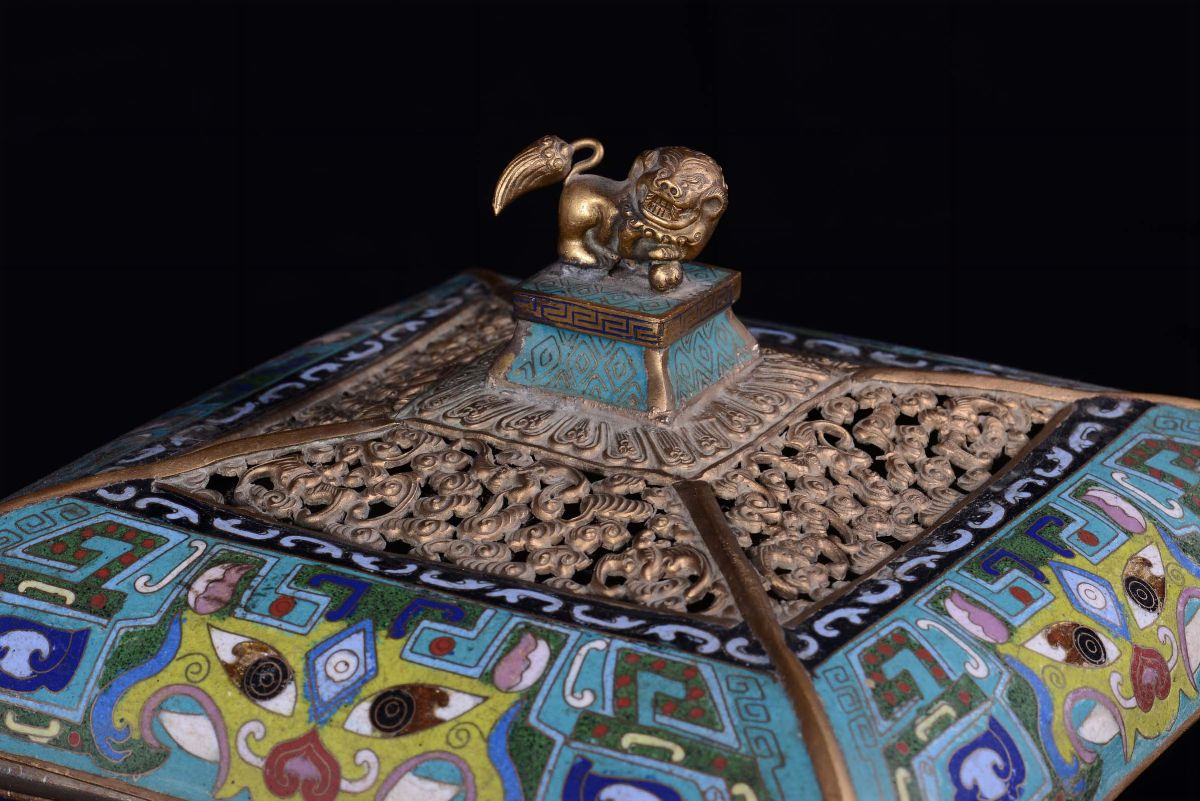 A cloisonné censer with handle in the shape of a gilt bronze Pho dog, China, Qing Dynasty, 19th century