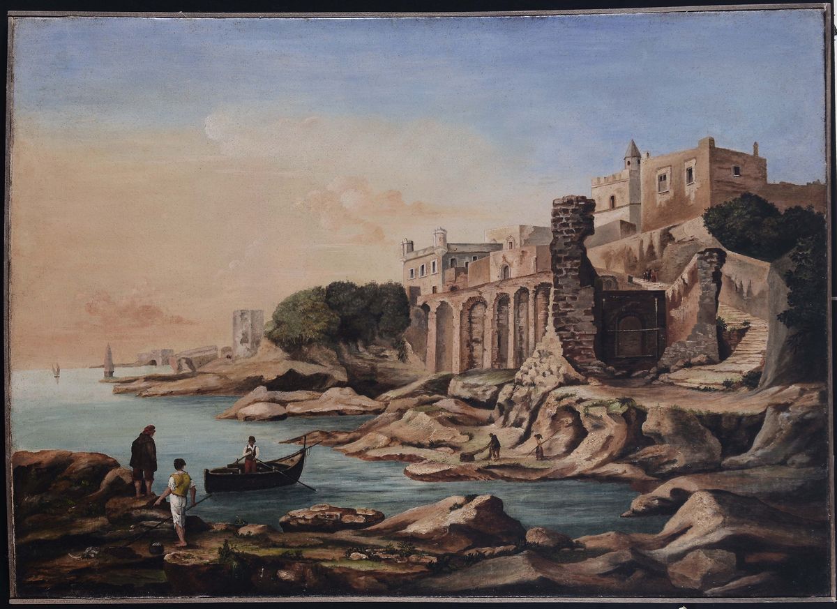 Anonimo del XIX secolo Paesaggio con cascata Veduta di paesaggio costiero