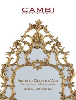 console con piano sagomato e tre gambe arcuate terminanti con piedi caprini, scarabattolo ad un’anta in stile neoclassico con cimasa centrata da fregio scolpito con elementi vegetali, floreali e cartiglio epigrafico contenente le lettere RSR, cm 90x10 [..]