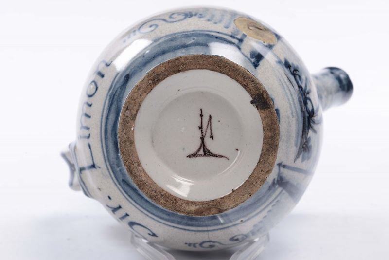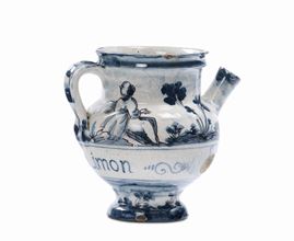 Boccale in maiolica di farmacia con decoro a scenografia barocca, Savona XVIII secolo