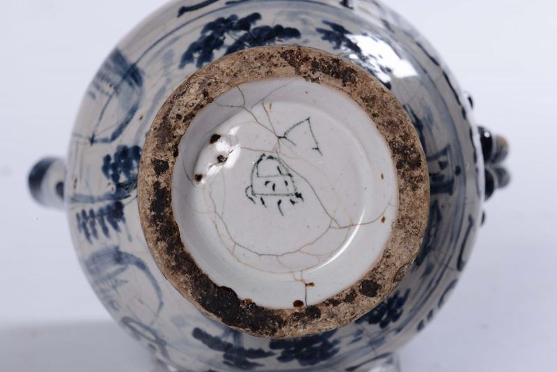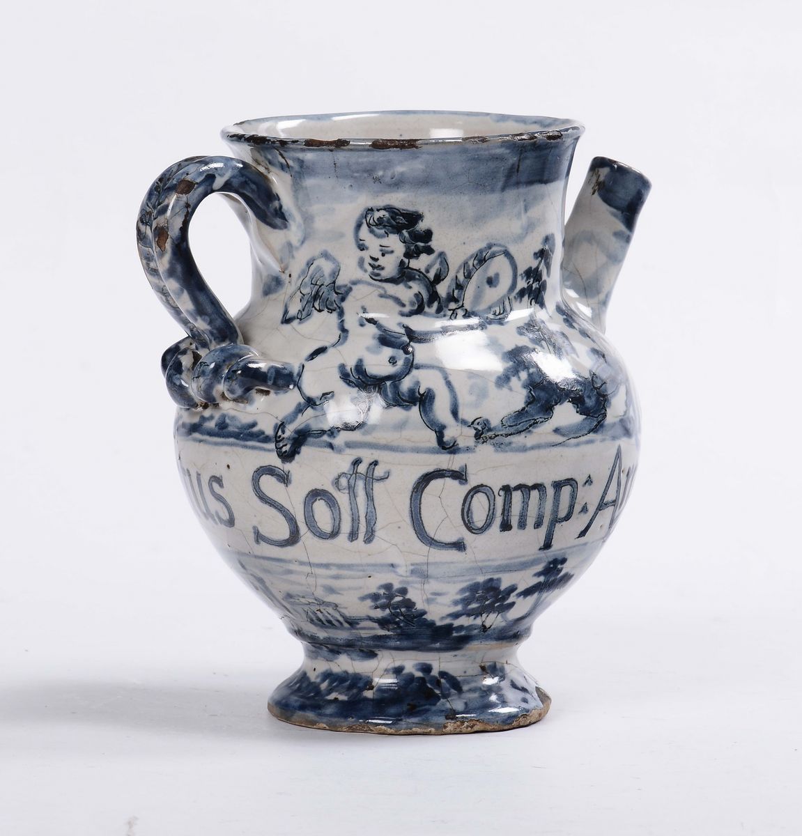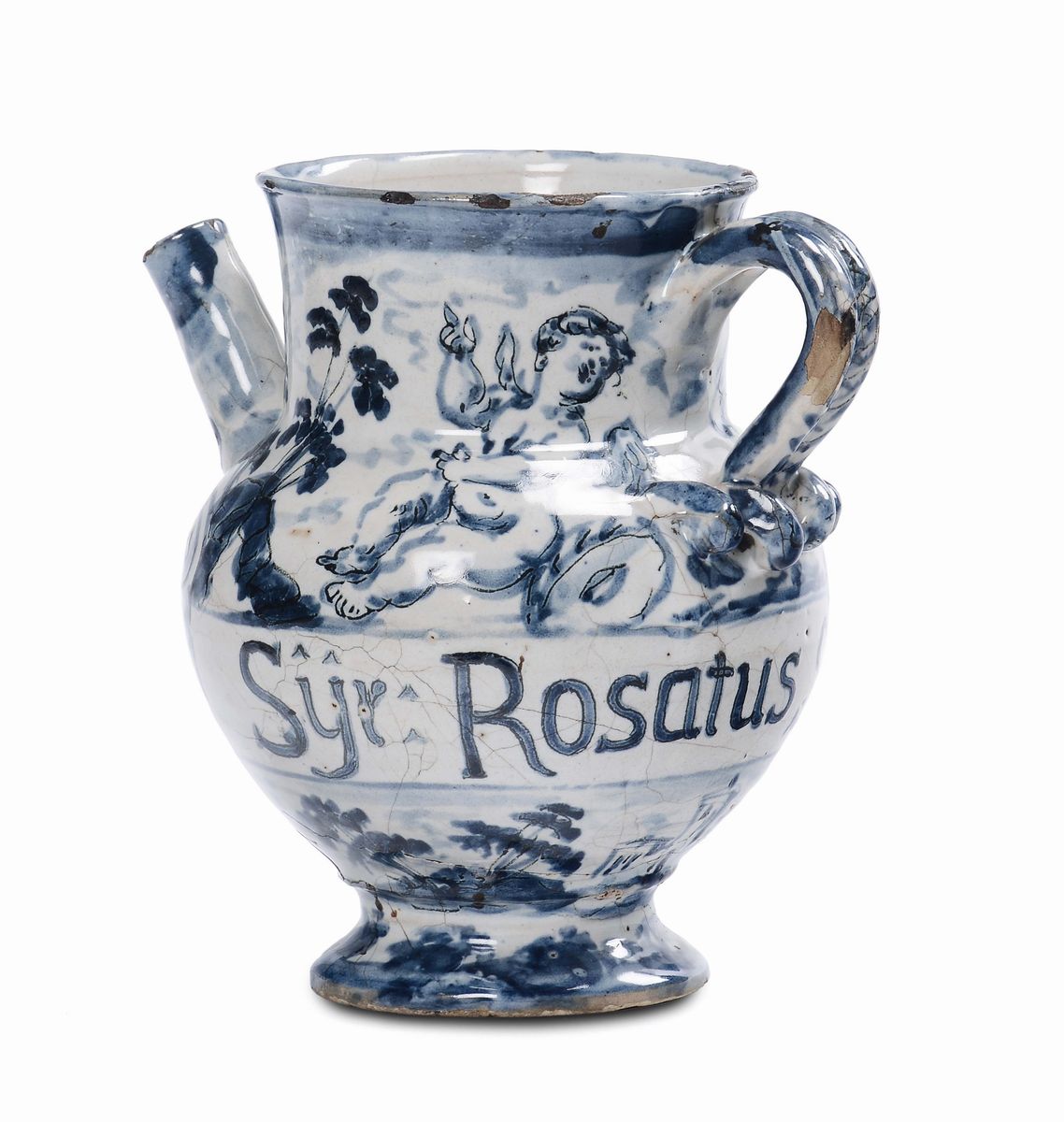 Boccale in maiolica di farmacia con decoro a scenografia barocca, Savona XVIII secolo