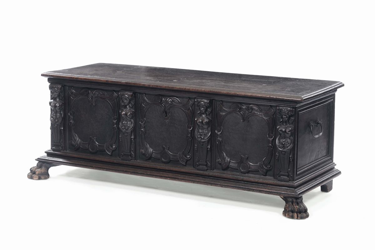 fronte pannellato decorato con lesene a guisa di figure femminili, piedi ferini, cm 182x69x65