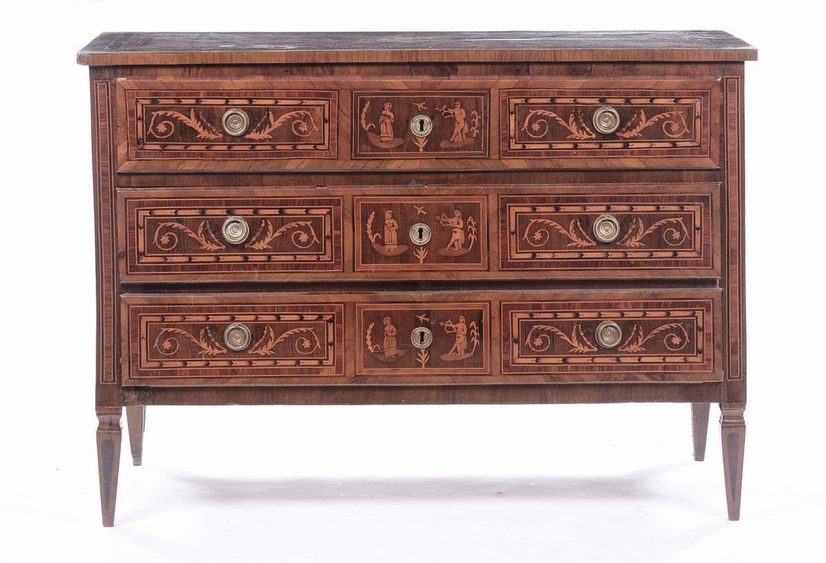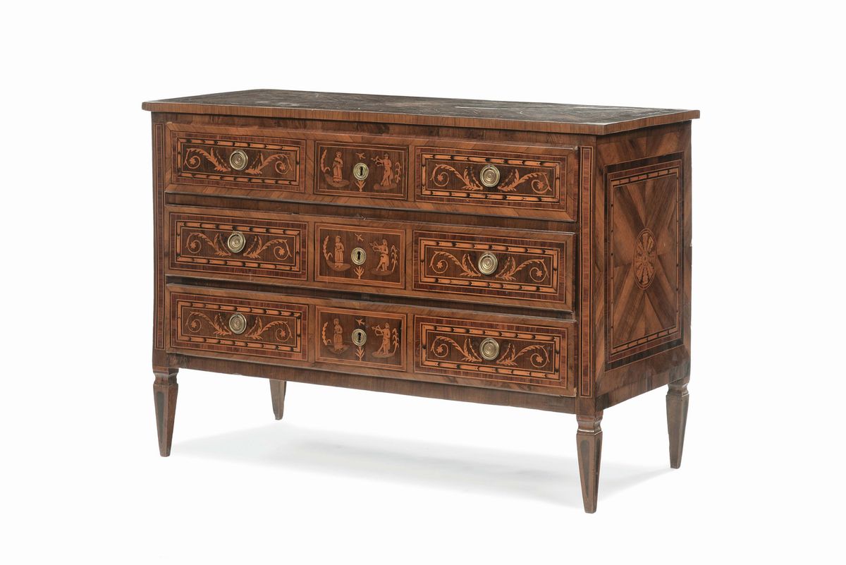 Coppia di cassettoni Luigi XVI interamente lastronati ed intarsiati, XVIII secolo