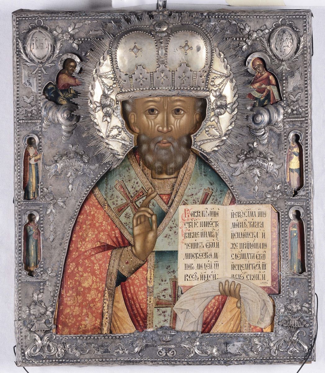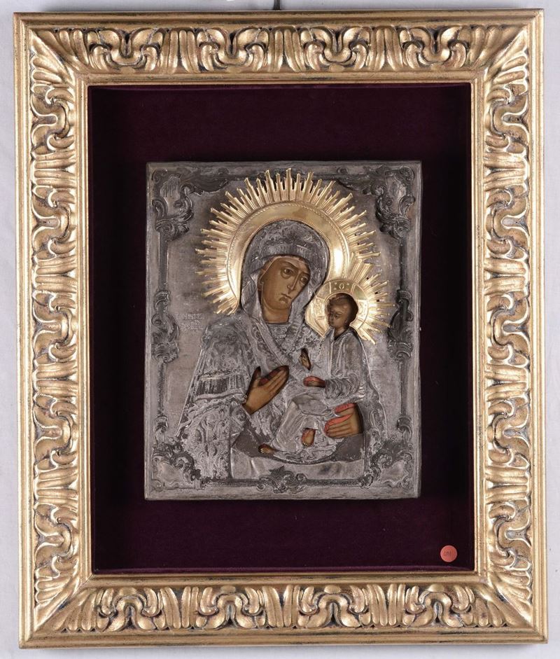 Due icone diverse raffiguranti Madonna con Bambino e Santo, Russia XIX secolo
