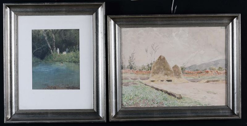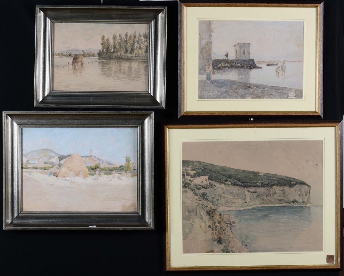 Sei dipinti raffiguranti paesaggi di campagne fertili, monte Epomeo, veduta di molo, bagno al fiume