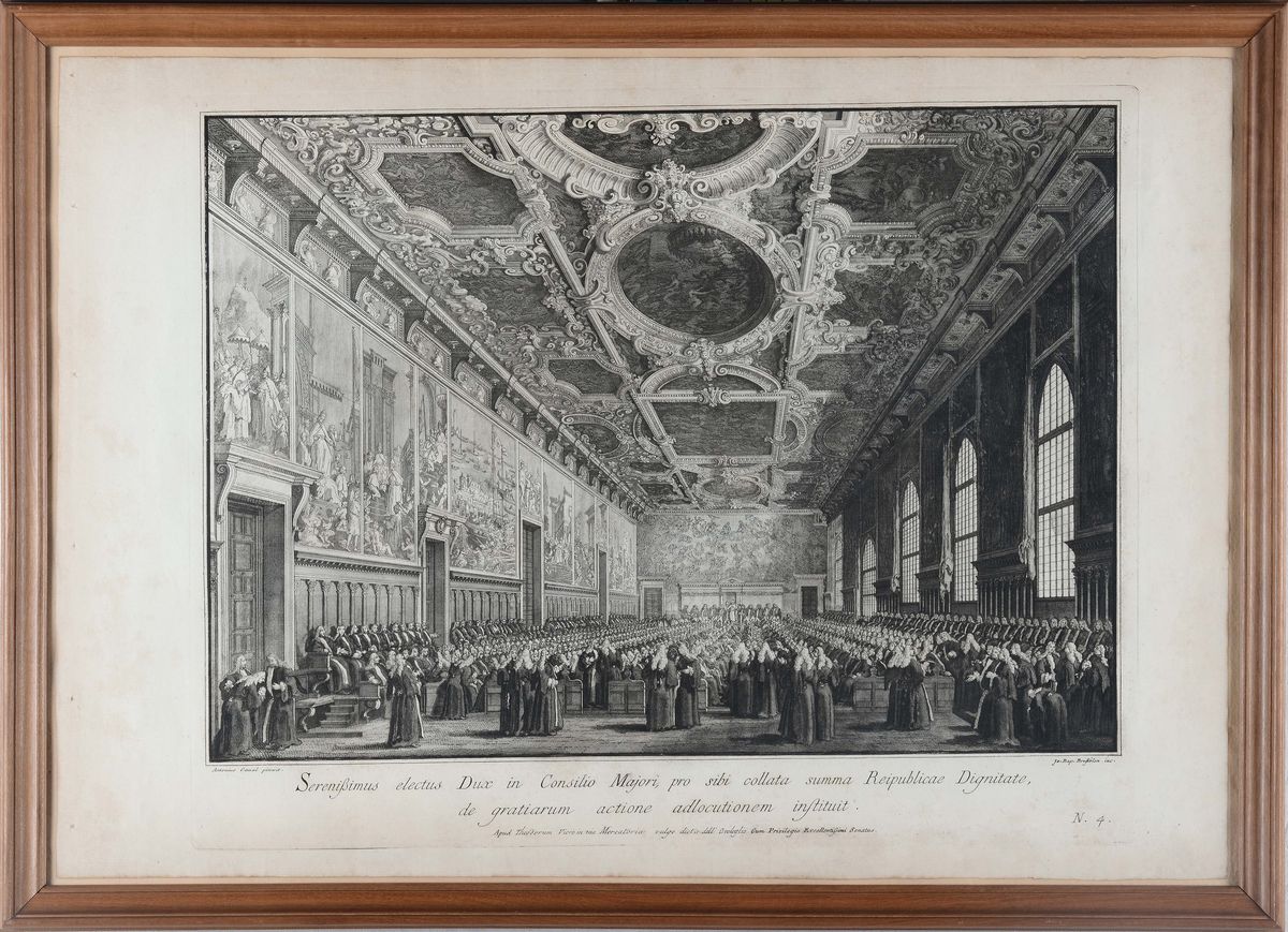 lotto di tre incisioni raffiguranti palazzi Veneziani, da dipinti di Canaletto, cm 50x70