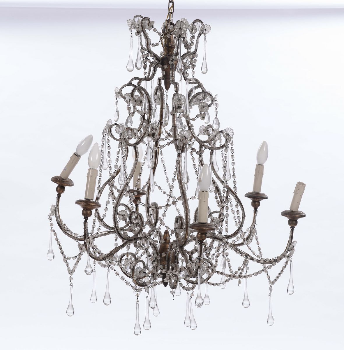 Lampadario a sei luci in metallo e cristalli, XIX secolo