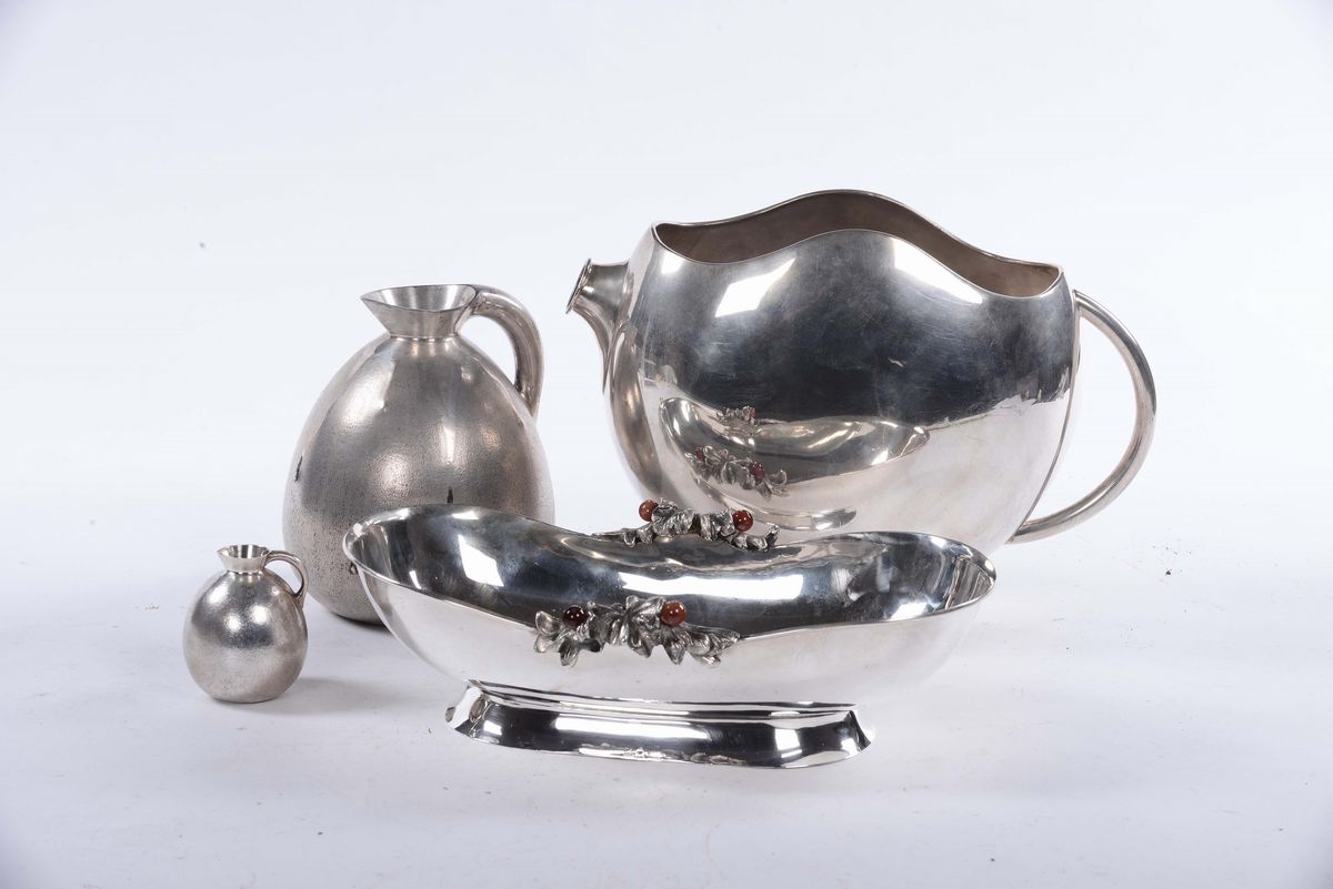 Lotto di tre brocche e un cestino ovale in argento