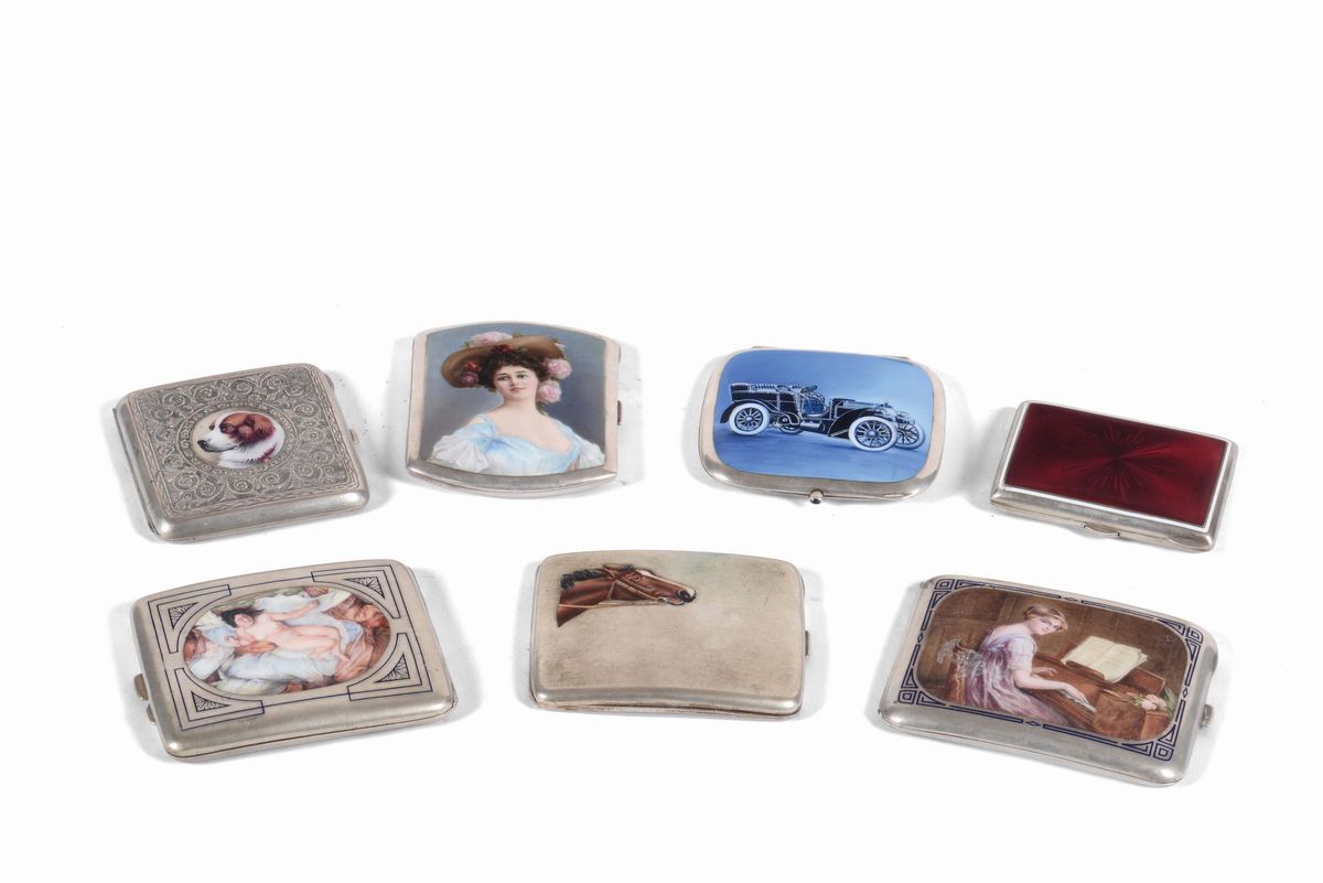 Lotto sette portasigarette in argento e smalti