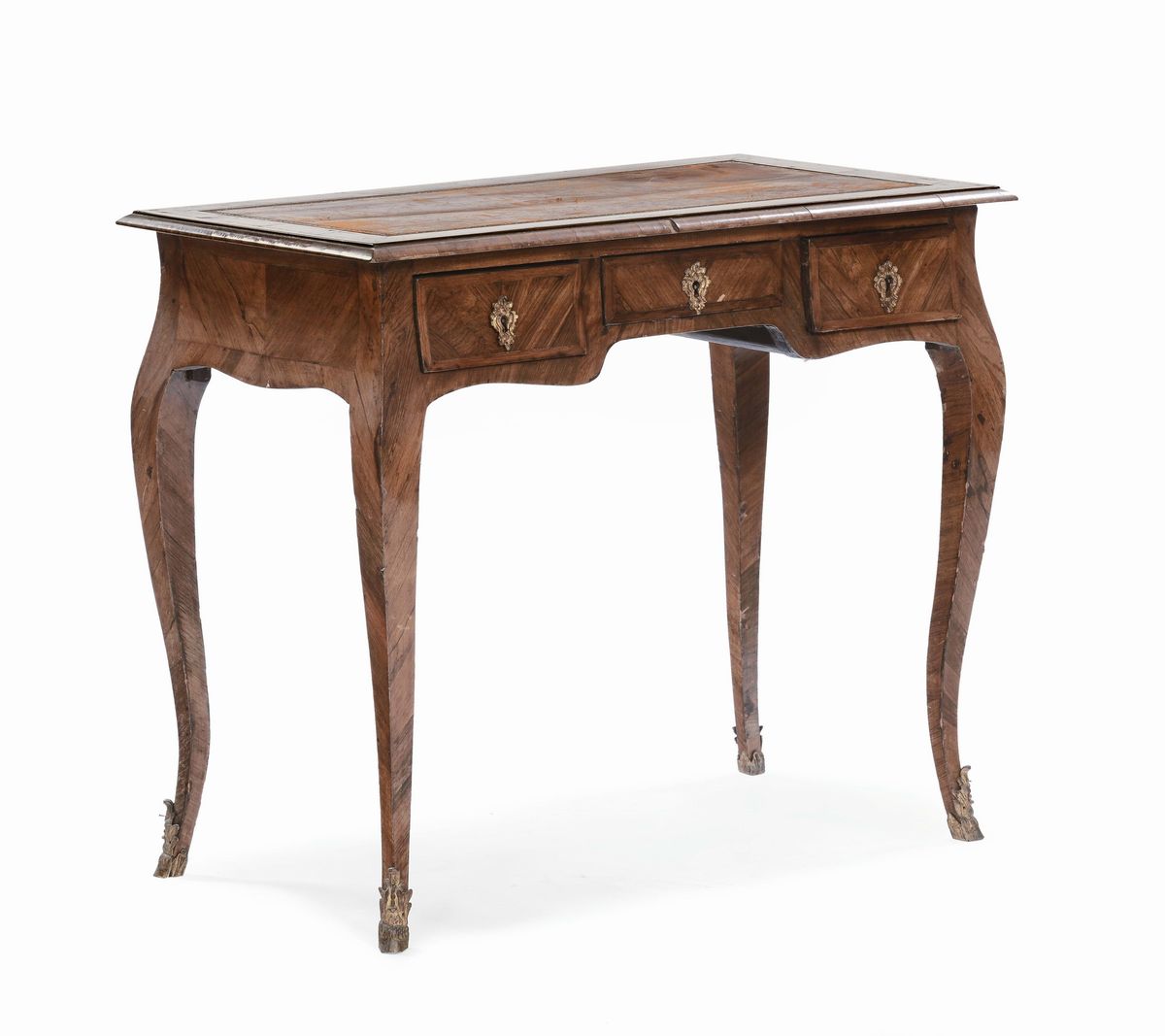 tre cassetti sulla fascia, gambe arcuate con scarpette in bronzo dorato, cm (difetti)