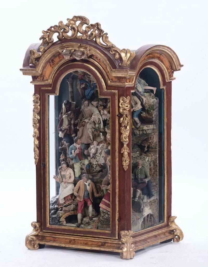 Presepe napoletano racchiuso in un fastoso e policromo scarabattolo in legno laccato, dipinto e dorato, XVIII-XIX secolo, [..]