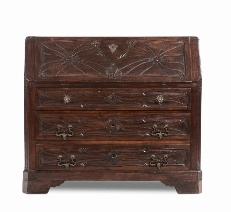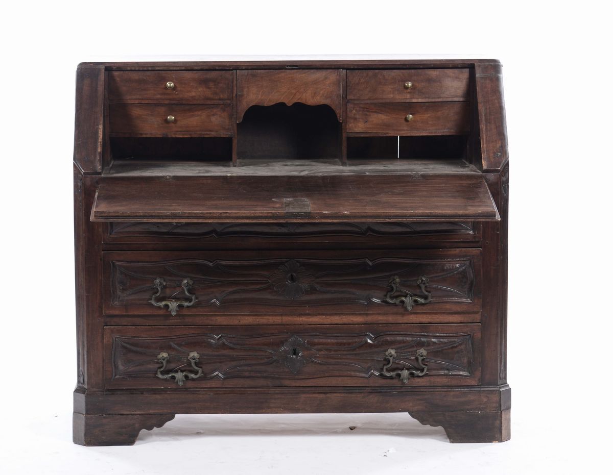 tre cassetti alla base, calatoia che cela cassettini e vani a giorno, piede a ciabatta, cm 121x51x106