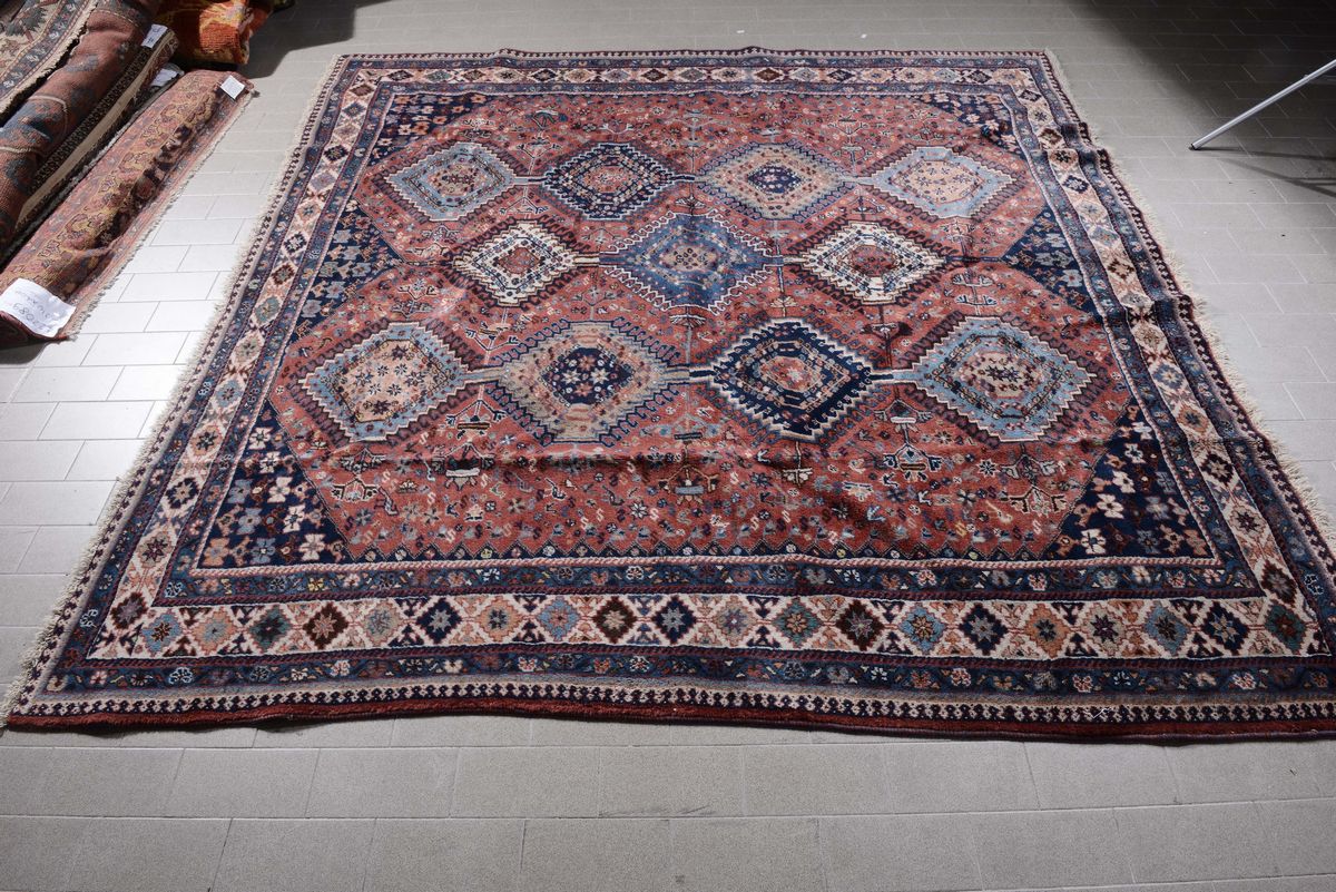 fondo rosso con file di medaglioni sovrapposti, cm 207x204
