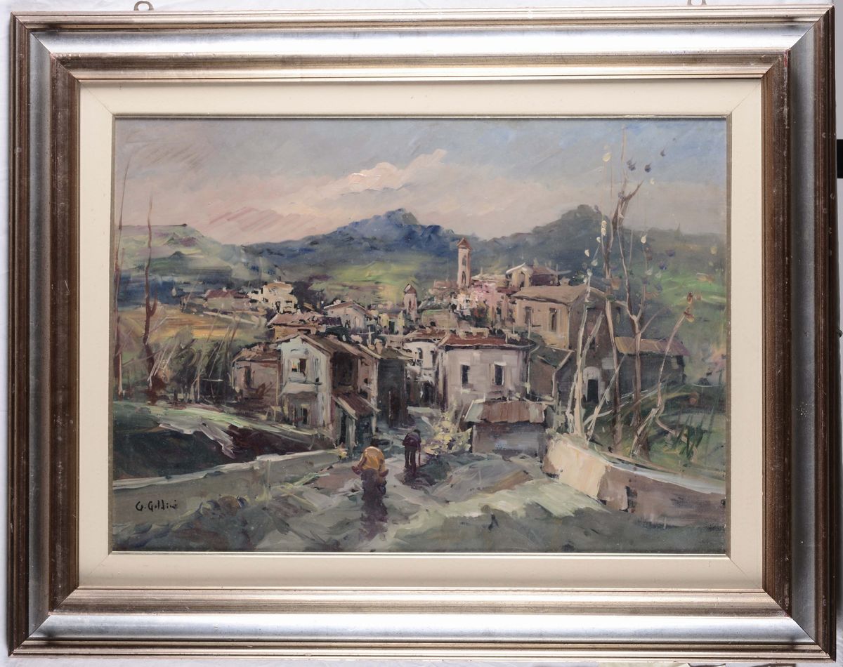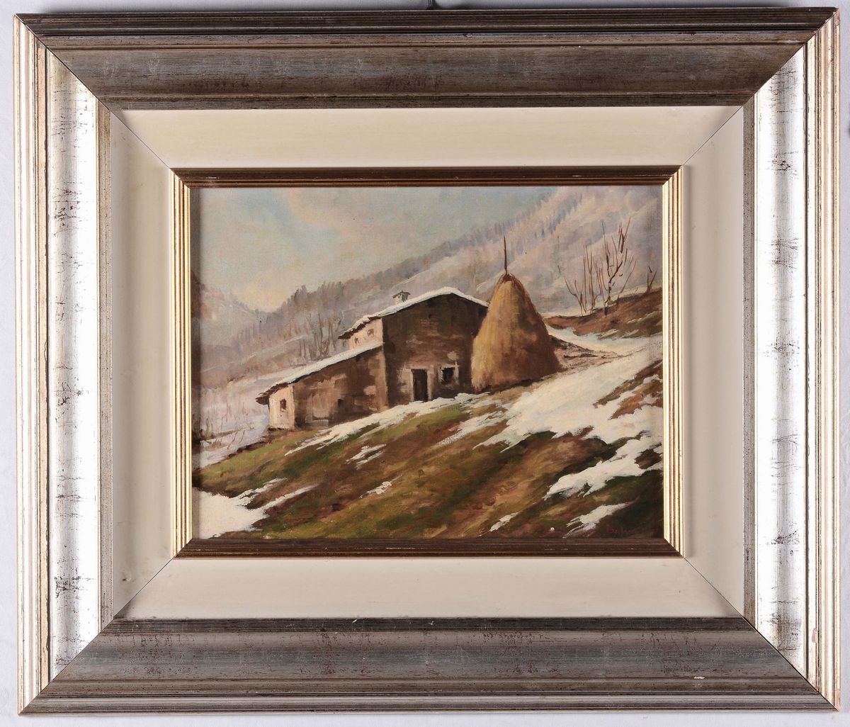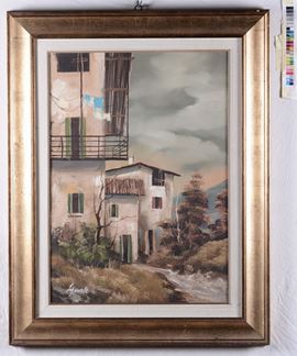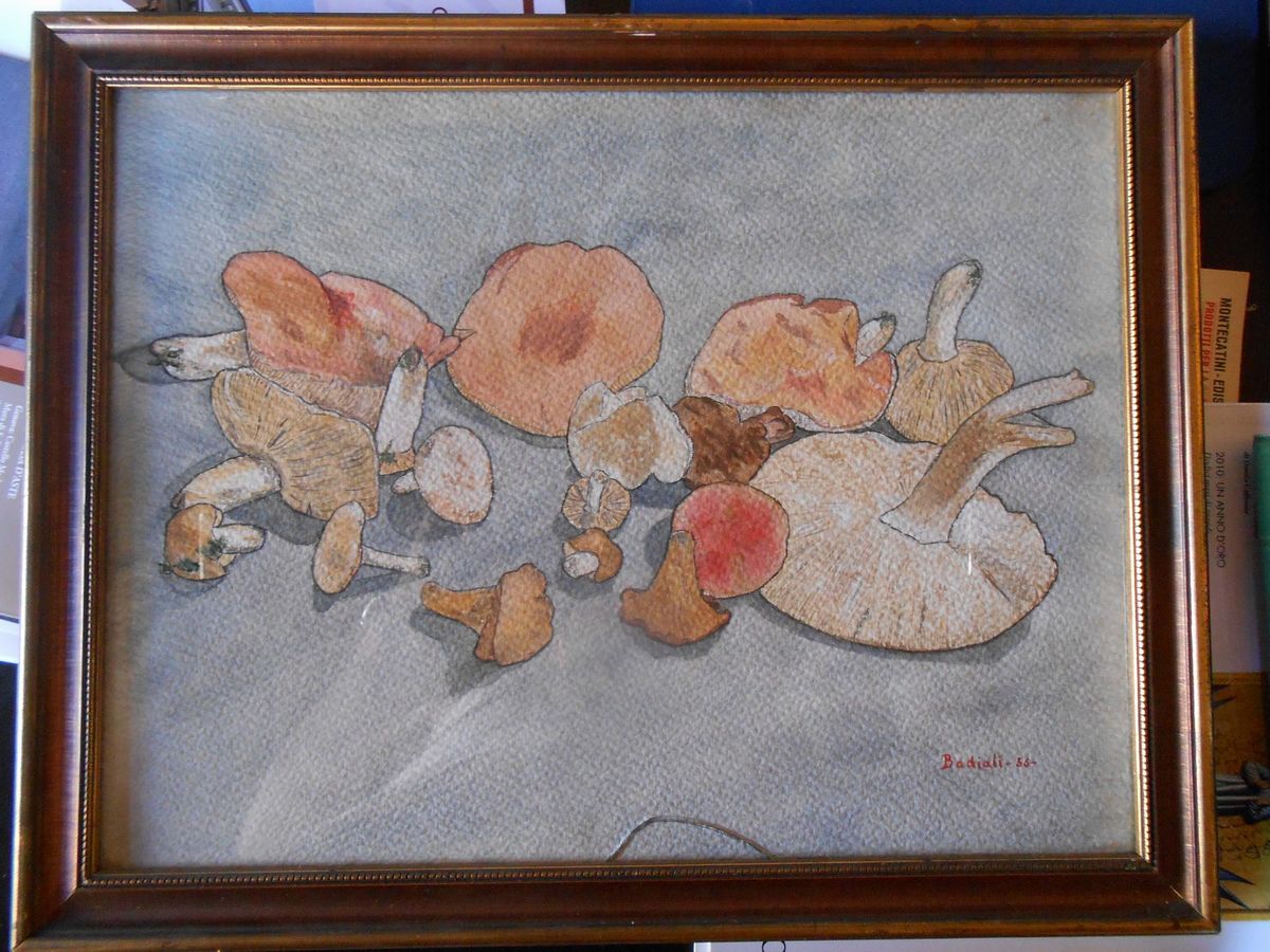 Tre dipinti con vedute montane e uno con funghi firmato Badiati 1956